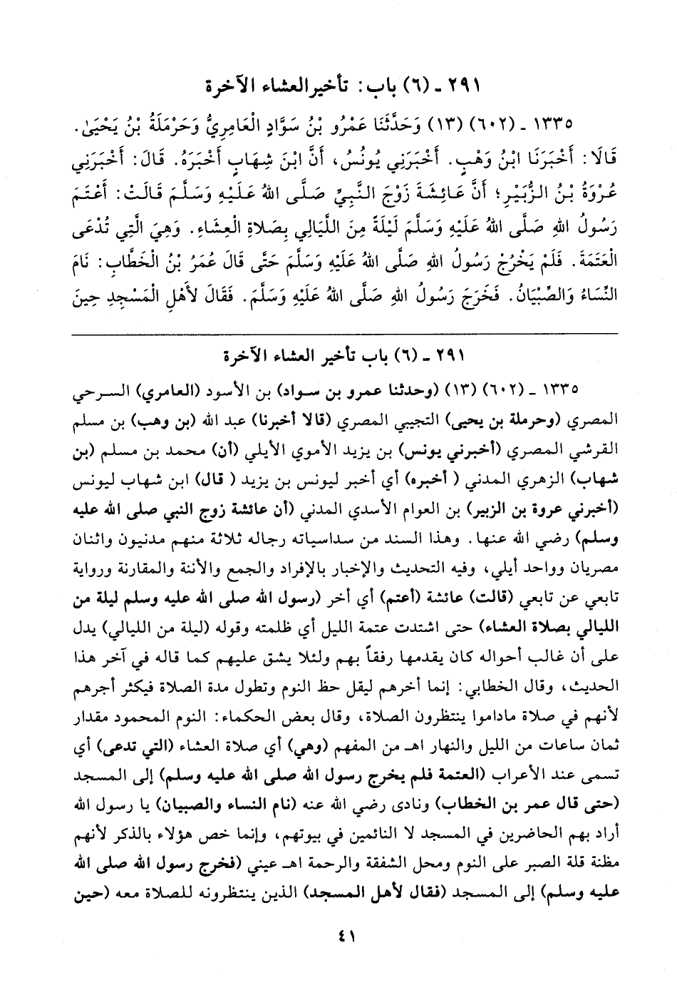 ١٣٣٥ - (٦٠٢) (١٣) وَحَدَّثَنَا عَمْرُو بْنُ سَوَّادٍ الْعَامِرِيُّ وَحَرْمَلَةُ بْنُ يَحْيَى. قَالا: أَخْبَرَنَا ابْنُ وَهْبٍ. أَخْبَرَنِي يُونُسُ، أَنَّ ابْنَ شِهَابٍ أَخْبَرَهُ. قَال: أَخْبَرَنِي عُرْوَةُ بْنُ الزبَيرِ؛ أَنَّ عَائِشَةَ زَوْجَ النَّبِيِّ - صلى الله عليه وسلم - قَالتْ: أَعْتَمَ رَسُولُ الله - صلى الله عليه وسلم - لَيلَةَ مِنَ اللَّيَالِي بِصَلاةِ الْعِشَاءِ. وَهِيَ الَّتِي تُدْعَى الْعَتَمَةَ. فَلَمْ يَخْرُجْ رَسُولُ اللهِ - صلى الله عليه وسلم - حَتَّى قَال عُمَرُ بن الْخَطَّابِ: نَامَ النِّسَاءُ وَالصِّبْيَانُ. فَخَرَجَ رَسُولُ اللهِ - صلى الله عليه وسلم -. فَقَال لأَهْلِ الْمَسْجِدِ حِينَ