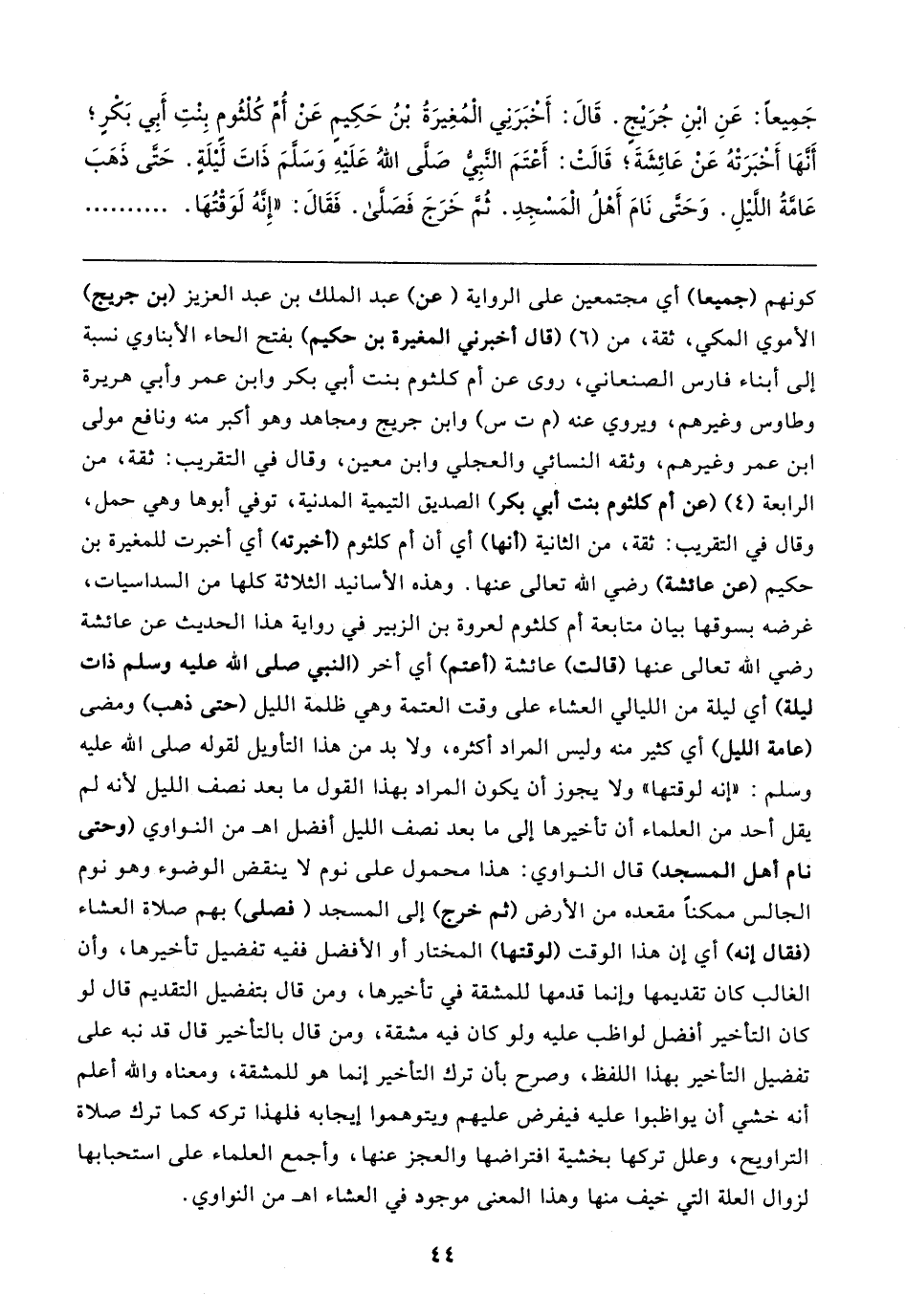 جَمِيعًا: عَنِ ابْنِ جُرَيجٍ. قَال: أخبَرَنِي الْمُغِيرَةُ بن حَكِيمِ عَنْ أُمً كُلثُومِ بِنْتِ أَبِي بَكْرٍ؛ أَنَّهَا أَخْبَرَتْهُ عَنْ عَائِشَةَ؛ قَالتْ: أَعْتَمَ النَّبِيُّ - صلى الله عليه وسلم - ذَاتَ لَيلَةٍ. حَتَّى ذَهَبَ عَامَّةُ اللَّيلِ. وَحَتَّى نَامَ أَهْلُ الْمَسجِدِ. ثُمَّ خَرَجَ فَصَلَّى. فَقَال: "إِنَّهُ لَوَقْتُهَا