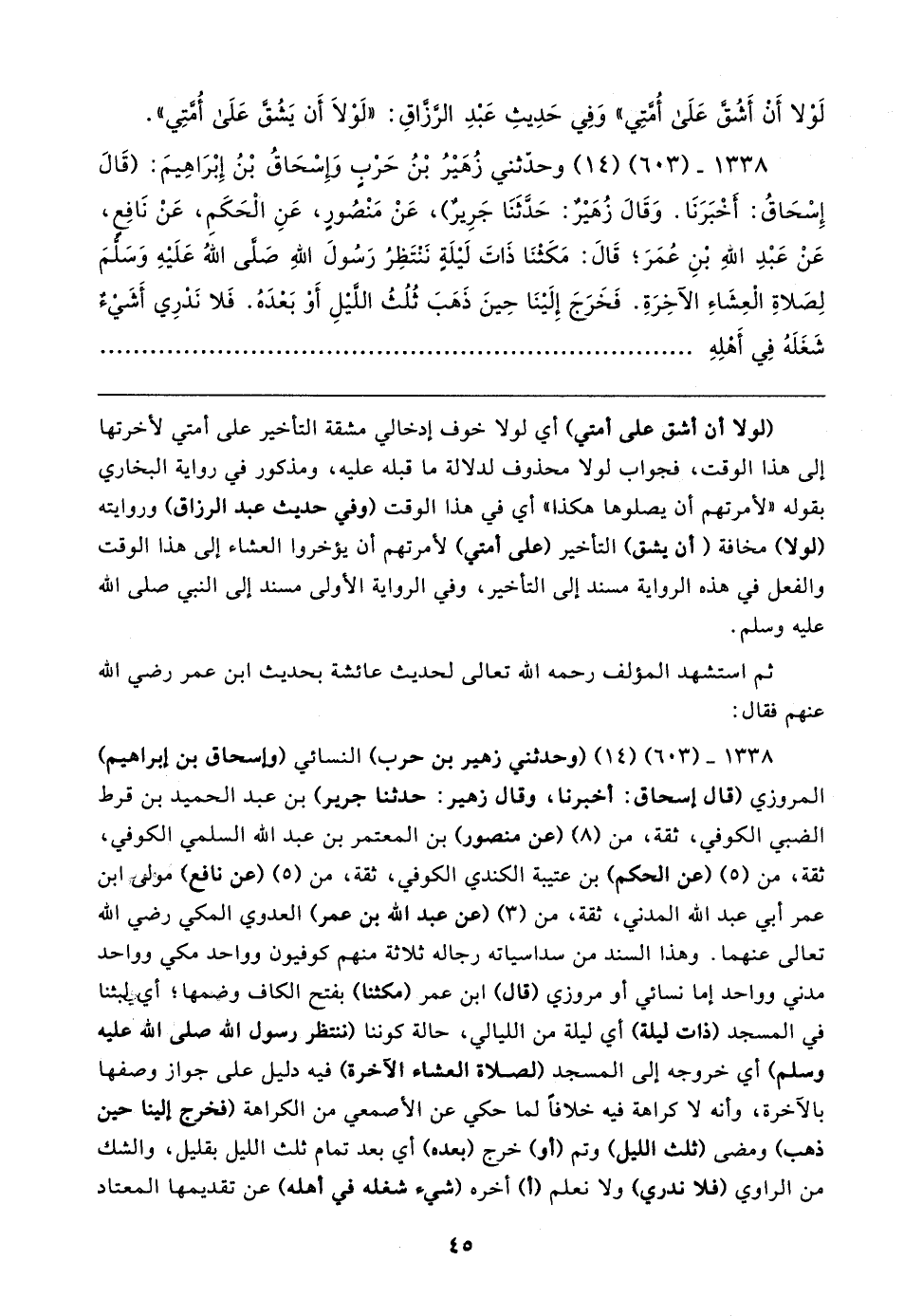 ١٣٣٨ - (٦٠٣) (١٤) وحدَّثني زُهَيرُ بْنُ حَرْبٍ وَإِسْحَاقُ بْنُ إِبْرَاهِيمَ: (قَال إِسْحَاقُ: أخْبَرَنَا. وَقَال زُهَيرٌ: حَدَّثَنَا جَرِيرٌ)، عَنْ مَنْصُورٍ، عَنِ الْحَكَمِ، عَنْ نَافِعٍ، عَنْ عَبْدِ اللهِ بنِ عُمَرَ؛ قَال: مَكَثْنَا ذَاتَ لَيلَةِ نَنتَظِرُ رَسُولَ اللهِ - صلى الله عليه وسلم - لِصَلاةِ الْعِشَاءِ الآخِرَةِ. فَخَرَجَ إِلَينَا حِينَ ذَهَبَ ثُلُثُ اللَّيلِ أَوْ بَعْدَهُ. فَلا نَدْرِي أَشَيءٌ شَغَلَهُ في أهلِهِ