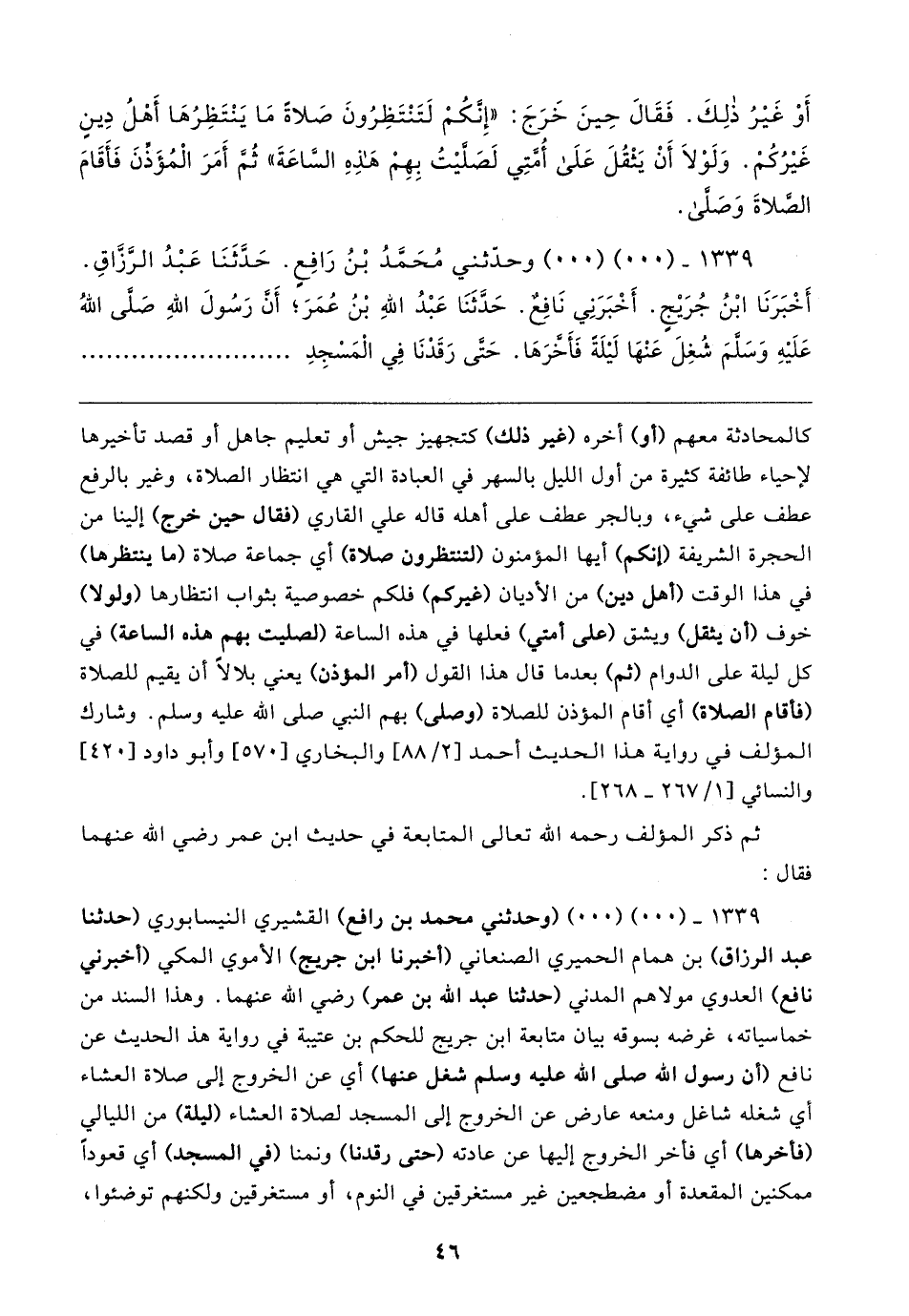١٣٣٩ - (٠٠) (٠٠) (وحدثني محمد بن رافع) القشيري النيسابوري (حدثنا عبد الرزاق) بن همام الحميري الصنعاني (أخبرنا ابن جريج) الأموي المكي (أخبرني نافع) العدوي مولاهم المدني (حدثنا عبد الله بن عمر) رضي الله عنهما. وهذا السند من خماسياته، غرضه بسوقه بيان متابعة ابن جريج للحكم بن عتيبة في رواية هذ الحديث عن نافع (أن رسول الله صلى الله عليه وسلم شغل عنه) أي عن الخروج إلى صلاة العشاء أي شغله شاغل ومنعه عارض عن الخروج إلى المسجد لصلاة العشاء اليلة) من الليالي (فأخرها) أي فأخر الخروج إليها عن عادته (حتى رقدنا) ونمنا (في المسجد) أي قعودًا ممكنين المقعدة أو مضطجعين غير مستغرقين في النوم، أو مستغرقين ولكنهم توضئوا،