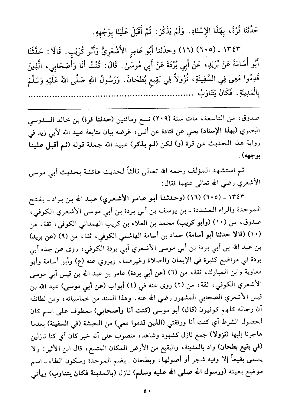 ١٣٤٣ - (٦٠٥) (١٦) (وحدثنا أبو عامر الأشعري) عبد الله بن براد -بفتح الموحدة والراء المشددة- بن يوسف بن أبي بردة بن أبي موسى الأشعري الكوفي، صدوق، من (١٠) (وأبو كريب) محمد بن العلاء بن كريب الهمداني الكوفي، ثقة، من (١٠) (قالا حدثنا أبو أسامة) حماد بن أسامة الهاشمي الكوفي، ثقة، من (٩) (عن بريد) بن عبد الله بن أبي بردة بن أبي موسى الأشعري أبي بردة الكوفي، روى عن جده أبي بردة في مواضع كثيرة في الإيمان والصلاة وغيرهما، ويروي عنه (ع) وأبو أسامة وأبو معاوية وابن المبارك، ثقة، من (٦) (عن أبي بردة) عامر بن عبد الله بن قيس أبي موسى الأشعري الكوفي، ثقة، من (٢) روى عنه في (٤) أبواب (عن أبي موسى) عبد الله بن قيس الأشعري الصحابي المشهور رضي الله عنه. وهذا السند من خماسياته، ومن لطائفه أن رجاله كلهم كوفيون (قال) أبو موسى كنت أنا وأصحابي) معطوف على اسم كان لحصول الشرط أي كنت أنا ورفقتي (الذين قدموا معي) من الحبشة (في السفينة) بعدما هاجرنا إليها (نزولا) جمع نازل كشهود وشاهد، منصوب على أنه خبر كان أي كنا نازلين (في بقيع بطحان) واد بالمدينة، والبقيع من الأرض المكان المتسع، قال ابن الأثير: ولا يسمى بقيعًا إلا وفيه شجر أو أصولها، وبطحان -بضم الموحدة وسكون الطاء- اسم موضع بعينه (ورسول الله صلى الله عليه وسلم) نازل (بالمدينة فكان يتناوب) ويأتي