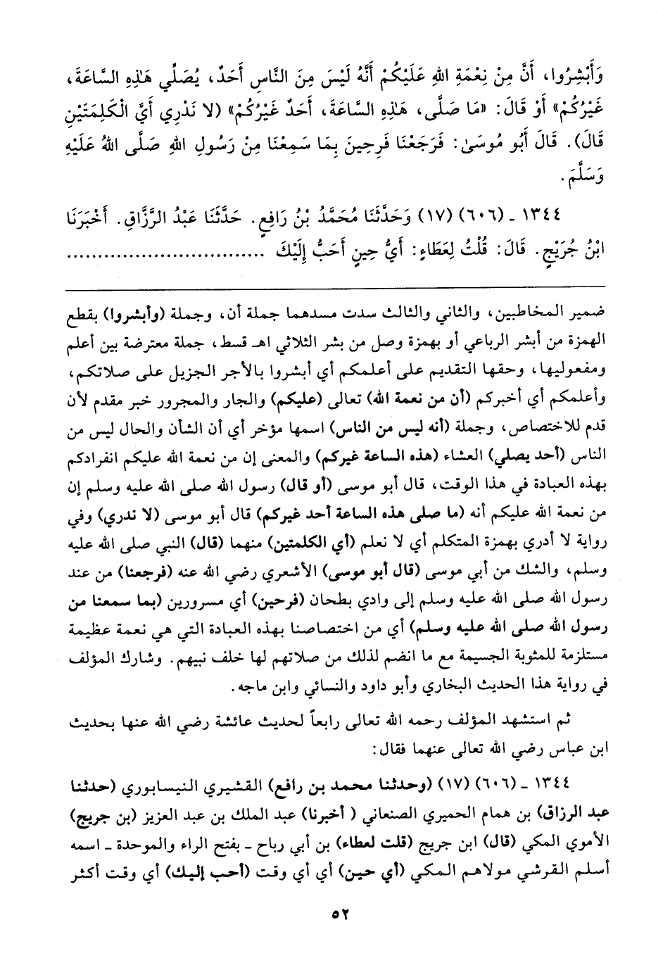 ضمير المخاطبين، والثاني والثالث سدت مسدهما جملة أن، وجملة (وأبشروا) بقطع الهمزة من أبشر الرباعي أو بهمزة وصل من بشر الثلاثي اهـ قسط، جملة معترضة بين أعلم ومفعوليها، وحقها التقديم على أعلمكم أي أبشروا بالأجر الجزيل على صلاتكم، وأعلمكم أي أخبركم (أنه من نعمة الله) تعالى (عليكم) والجار والمجرور خبر مقدم لأن قدم للاختصاص، وجملة (أنه ليس من الناس) اسمها مؤخر أي أن الشأن والحال ليس من الناس (أحد يصلي) العشاء (هذه الساعة غيركم) والمعنى إن من نعمة الله عليكم انفرادكم بهذه العبادة في هذا الوقت، قال أبو موسى (أو قال) رسول الله صلى الله عليه وسلم إن من نعمة الله عليكم أنه (ما صلى هذه الساعة أحد غيركم) قال أبو موسى (لا ندري) وفي رواية لا أدري بهمزة المتكلم أي لا نعلم (أي الكلمتين) منهما (قال) النبي صلى الله عليه وسلم، والشك من أبي موسى (قال أبو موسى) الأشعري رضي الله عنه (فرجعنا) من عند رسول الله صلى الله عليه وسلم إلى وادي بطحان (فرحين) أي مسرورين (بما سمعنا من رسول الله صلى الله عليه وسلم) أي من اختصاصنا بهذه العبادة التي هي نعمة عظيمة مستلزمة للمثوبة الجسيمة مع ما انضم لذلك من صلاتهم لها خلف نبيهم. وشارك المؤلف في رواية هذا الحديث البخاري وأبو داود والنسائي وابن ماجه.