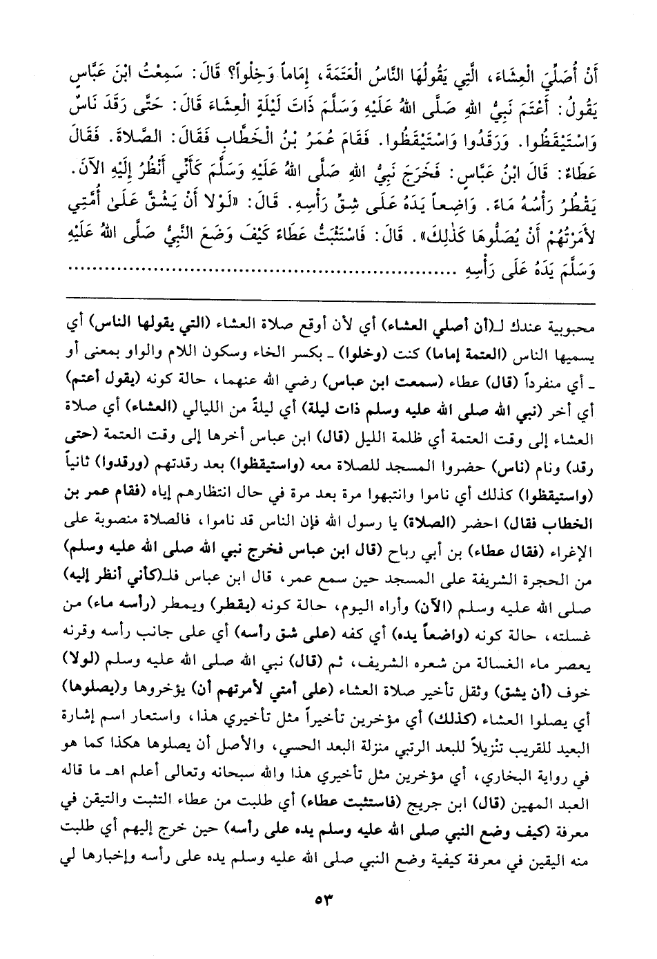 يَقُولُ: أَعْتَمَ نَبِيُّ اللهِ - صلى الله عليه وسلم - ذَاتَ لَيلَةِ الْعِشَاءَ قَال: حَتَّى رَقَدَ نَاسٌ وَاسْتَيقَظُوا. وَرَقَدُوا وَاسْتَيقَظُوا. فَقَامَ عُمَرُ بْنُ الْخَطاب فَقَال: الصَّلاةَ. فَقَال عَطَاءٌ: قَال ابْنُ عَبَّاسِ: فَخَرَجَ نَبِي اللهِ - صلى الله عليه وسلم - كَأَنِّي أَنْظُرُ إِلَيهِ الآنَ. يَقْطُرُ رَأْسُهُ مَاءً. وَاضِعًا يَدَهُ عَلَى شِق رَأْسِهِ. قَال: "لَوْلا أَنْ يَشُقَّ عَلَى أُمَّتِي لأمرْتُهُمْ أَنْ يُصلُّوهَا كَذلِكَ". قَال: فَاسْتَثْبَتُّ عَطَاء كَيفَ وَضَعَ النَّبِيُّ - صلى الله عليه وسلم - يَدَهُ عَلَى رَأْسِهِ