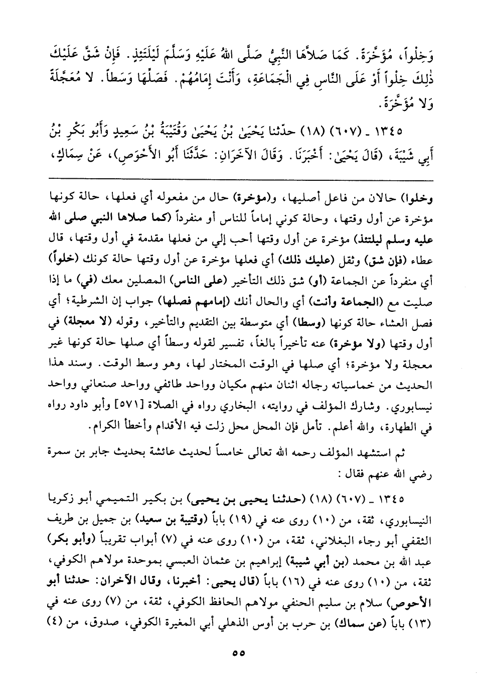 وَخِلْوًا، مُؤَخَّرَةً. كَمَا صَلَّاهَا النَّبِيُّ صَلَّى اللهُ عَلَيهِ وَسَلَّمَ لَيلَتَئِذِ. فَإِنْ شَقَّ عَلَيكَ ذلِكَ خِلْوًا أَوْ عَلَى النَّاسِ في الْجَمَاعَةِ، وَأَنْتَ إِمَامُهُمْ. فَصَلْهَا وَسَطًا. لا مُعَجَّلَةً وَلا مُؤَخَّرَةً.