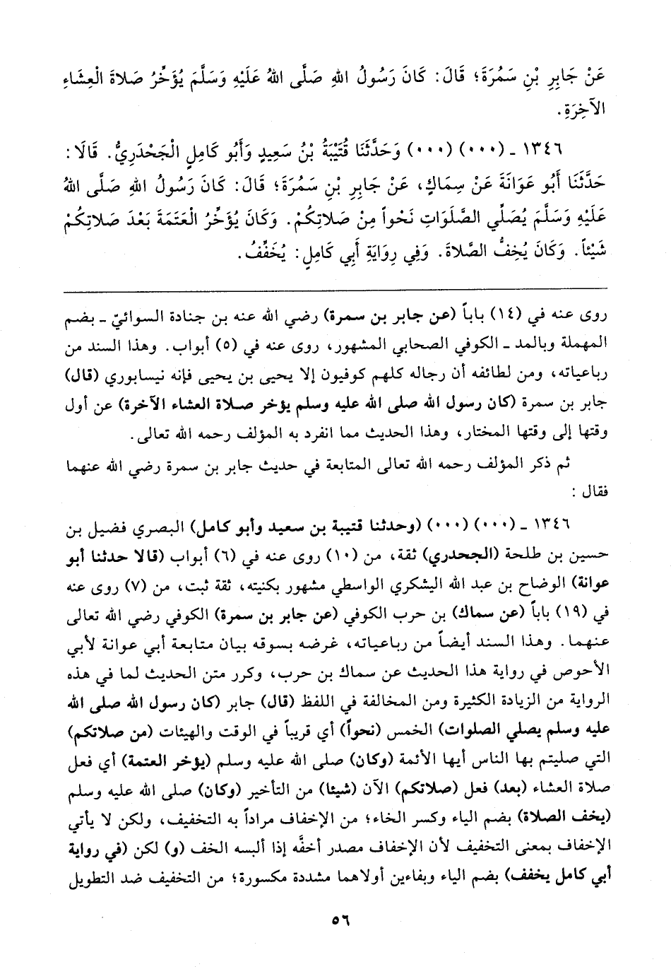 ١٣٤٦ - (٠٠) (٠٠) وَحَدَّثَنَا قُتَيبَةُ بْنُ سَعِيدٍ وَأَبُو كَامِلٍ الْجَحْدَرِيُّ. قَالا: حَدَّثَنَا أَبُو عَوَانَةَ عَنْ سِمَاكٍ، عَنْ جَابِرِ بْنِ سَمُرَةَ؛ قَال: كَانَ رَسُولُ اللهِ صَلَّى اللهُ عَلَيهِ وَسَلَّمَ يُصَلِّي الصَّلَوَاتِ نَحْوًا مِنْ صَلاتِكُمْ. وَكَانَ يُؤَخِّرُ الْعَتَمَةَ بَعْدَ صَلاتِكُمْ شَيئًا. وَكَانَ يُخِفُّ الصَّلاةَ. وَفِي رِوَايَةِ أَبِي كَامِلٍ: يُخَفِّفُ