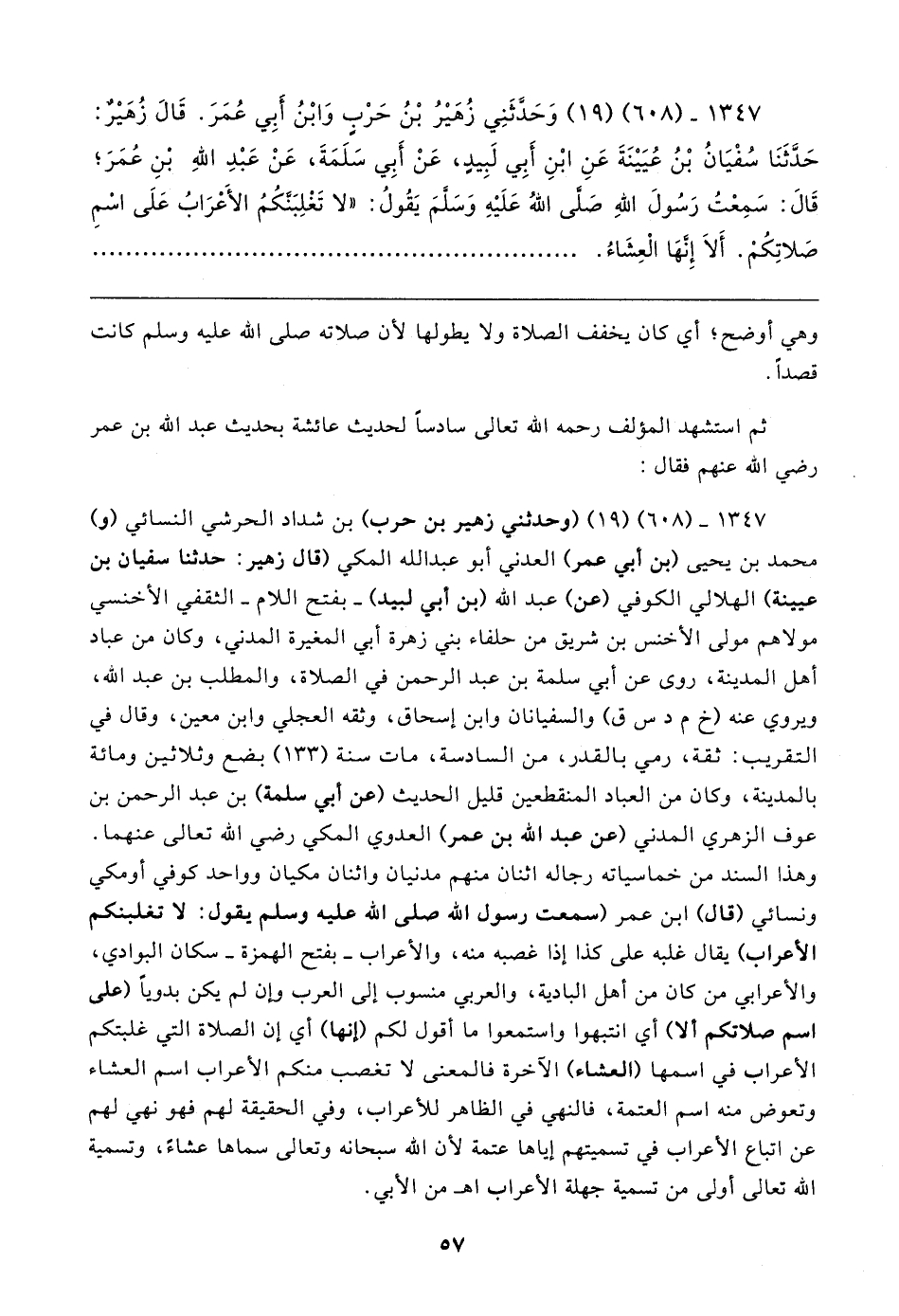 ١٣٤٧ - (٦٠٨) (١٩) وَحَدَّثَنِي زُهَيرُ بْنُ حَرْبٍ وَابْنُ أَبِي عُمَرَ. قَال زُهَيرٌ: حَدَّثَنَا سُفْيَانُ بْنُ عُيَينَةَ عَنِ ابْنِ أَبِي لَبِيدٍ، عَنْ أَبِي سَلَمَةَ، عَنْ عَبْدِ اللهِ بْنِ عُمَرَ؛ قَال: سَمِعْتُ رَسُولَ اللهِ صَلَّى اللهُ عَلَيهِ وَسَلَّمَ يَقُولُ: "لا تَغْلِبَنَّكُمُ الأعرَابُ عَلَى اسْمِ صَلاتِكُمْ. أَلا إِنَّهَا الْعِشَاءُ