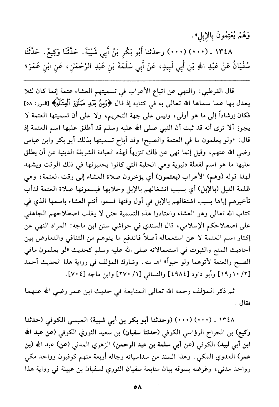 ١٣٤٨ - (٠٠) (٠٠) (وحدثنا أبو بكر بن أبي شيبة) العبسي الكوفي (حدثنا وكيع) بن الجراح الرؤاسي الكوفي (حدثنا سفيان) بن سعيد الثوري الكوفي (عن عبد الله ابن أبي لبيد) الكوفي (عن أبي سلمة بن عبد الرحمن) الزهري المدني (عن) عبد الله (بن عمر) العدوي المكي. وهذا السند من سداسياته رجاله أربعة منهم كوفيون وواحد مكي وواحد مدني، وغرضه بسوقه بيان متابعة سفيان الثوري لسفيان بن عيينة في رواية هذا