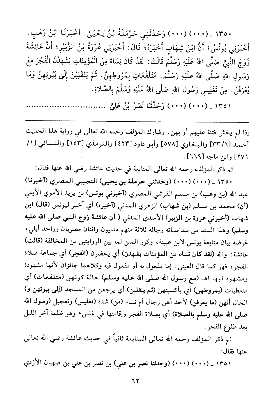 ١٣٥٠ - (٠٠) (٠٠) (وحدثني حرملة بن يحيى) التجيبي المصري (أخبرنا) عبد الله (بن وهب) بن مسلم القرشي المصري (أخبرني يونس) بن يزيد الأموي الأيلي (أن) محمد بن مسلم (بن شهاب) الزهري المدني (أخبره) أي أخبر ليونس (قال) ابن شهاب (أخبرني عروة بن الزبير) الأسدي المدني (أن عائشة زوج النبي صلى الله عليه وسلم) وهذا السند من سداسياته رجاله ثلاثة منهم مدنيون واثنان مصريان وواحد أيلي، غرضه بيان متابعة يونس لابن عيينة، وكرر المتن لما بين الروايتين من المخالفة (قالت) عائشة: والله (لقد كان نساء من المؤمنات يشهدن) أي يحضرن (الفجر) أي جماعة صلاة الفجر، فهو كما قال العيني: إما مفعول به أو مفعول فيه وكلاهما جائزان لأنها مشهودة ومشهود فيها اهـ (مع رسول الله صلى الله عليه وسلم) حالة كونهن (متلفعات) أي متغطيات (بمروطهن) أي بأكسيتهن (ثم ينقلبن) أي يرجعن من المسجد (إلى بيوتهن و) الحال أنهن (ما يعرفن) لأحد أهن رجال أم نساء (من) شدة (تغليس) وتعجيل (رسول الله صلى الله عليه وسلم بالصلاة) أي بصلاة الفجر وإقامتها في غلس؛ وهو ظلمة آخر الليل بعد طلوع الفجر.