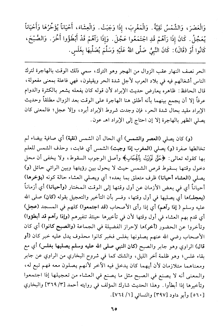 وَالْعَصْرَ، وَالشَّمْسُ نَقِيَّةٌ. وَالْمَغْرِبَ، إِذَا وَجَبَتْ. وَالْعِشَاءَ، أَحْيَانَا يُؤَخرُهَا وَأَحْيَانًا يُعَجِّلُ. كَانَ إِذَا رَآهُمْ قَدِ اجْتَمَعُوا عَجَّلَ. وَإِذَا رَآهُمْ قَدْ أَبْطَؤُوا أَخَّرَ. وَالصُّبْحَ، كَانُوا أَوْ (قَال): كَانَ النَّبِيُّ صَلَّى اللهُ عَلَيهِ وَسَلَّمَ يُصَلِّيهَا بِغَلَسٍ