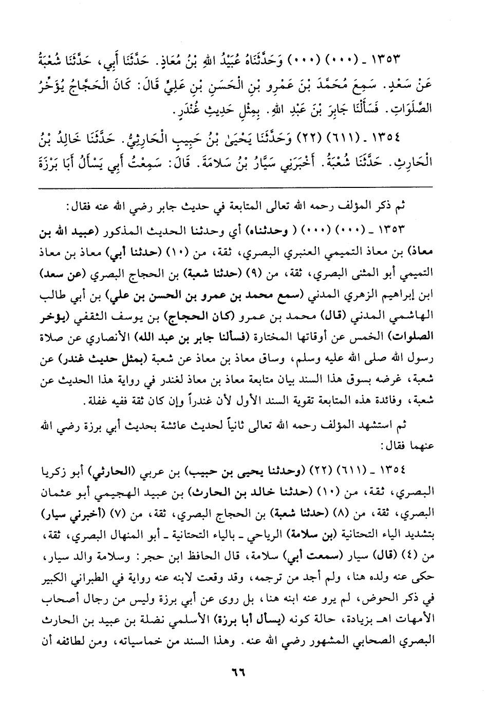 ١٣٥٣ - (٠٠) (٠٠) (وحدثناه) أي وحدثنا الحديث المذكور (عبيد الله بن معاذ) بن معاذ التميمي العنبري البصري، ثقة، من (١٠) (حدَّثنا أبي) معاذ بن معاذ التميمي أبو المثنى البصري، ثقة، من (٩) (حدَّثنا شعبة) بن الحجاج البصري (عن سعد) ابن إبراهيم الزُّهريّ المدني (سمع محمَّد بن عمرو بن الحسن بن علي) بن أبي طالب الهاشمي المدني (قال) محمَّد بن عمرو (كان الحجاج) بن يوسف الثَّقفيُّ (يؤخر الصلوات) الخمس عن أوقاتها المختارة (فسألنا جابر بن عبد الله) الأنصاري عن صلاة رسول الله صَلَّى الله عليه وسلم، وساق معاذ بن معاذ عن شعبة (بمثل حديث غندر) عن شعبة، غرضه بسوق هذا السند بيان متابعة معاذ بن معاذ لغندر في رواية هذا الحديث عن شعبة، وفائدة هذه المتابعة تقوية السند الأوَّل لأنَّ غندرًا وإن كان ثقة ففيه غفلة.