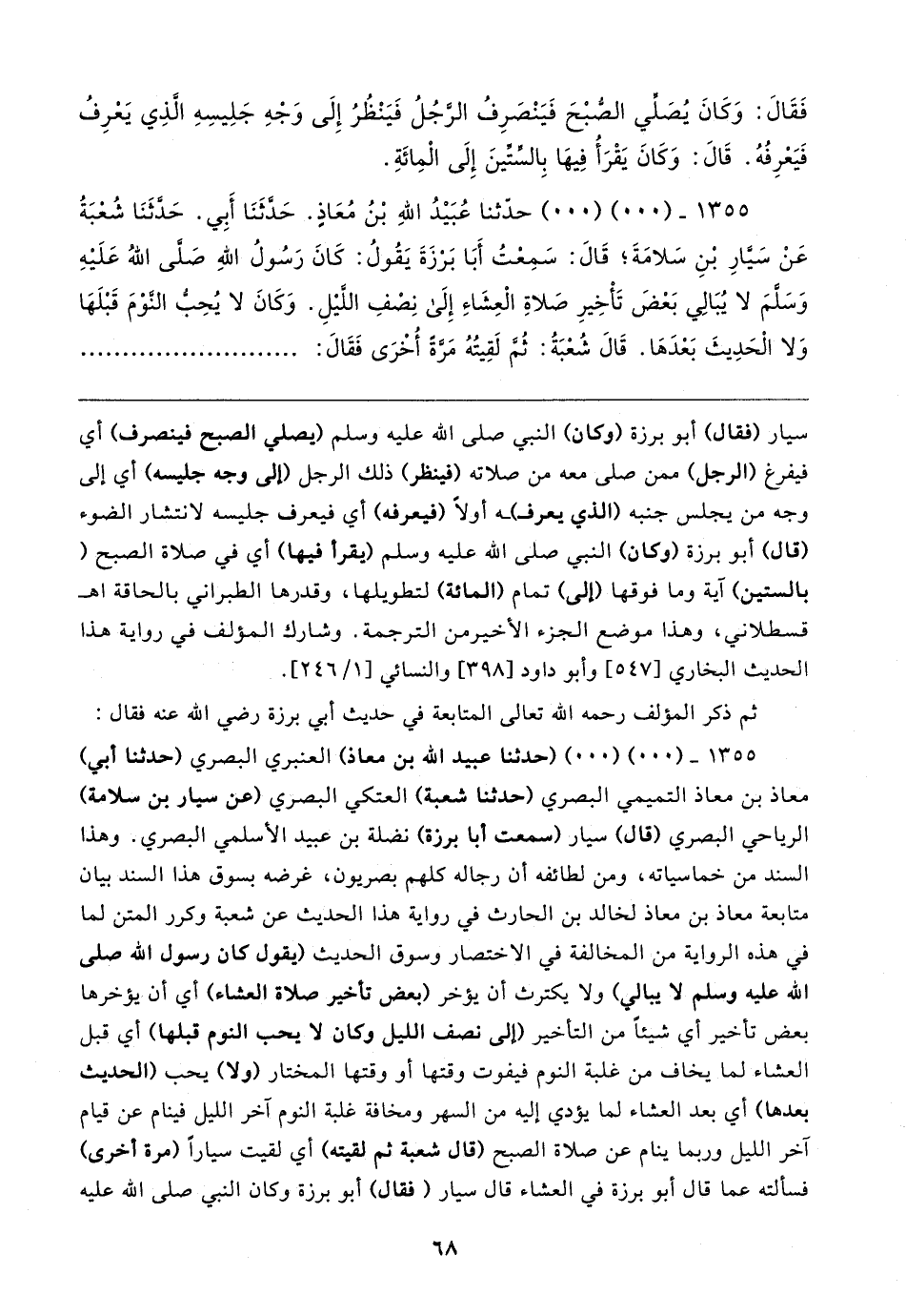 ١٣٥٥ - (٠٠) (٠٠) حدَّثنا عُبَيدُ اللهِ بْنُ مُعَاذٍ. حَدَّثَنَا أَبِي. حَدَّثَنَا شُعْبَةُ عَنْ سَيارِ بْنِ سَلامَةَ؛ قَال: سَمِعْتُ أَبَا بَرْزَةَ يَقُولُ: كَانَ رَسُولُ اللهِ صَلَّى اللهُ عَلَيهِ وَسَلَّمَ لا يُبَالِي بَعْضَ تَأْخِيرِ صَلاةِ الْعِشَاءِ إِلَى نِصْفِ اللَّيلِ. وَكَانَ لا يُحِبُّ النَّوْمَ قَبْلَهَا وَلا الْحَدِيثَ بَعْدَهَا. قَال شُعْبَةُ: ثُمَّ لَقِيتُهُ مَرة أُخْرَى فَقَال: