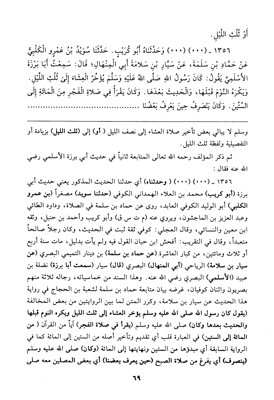 ١٣٥٦ - (٠٠) (٠٠) (وحدثناه) أي حدَّثنا الحديث المذكور يعني حديث أبي برزة (أبو كريب) محمَّد بن العلاء الهمداني الكوفيّ (حدَّثنا سويد) مصغرًا (بن عمرو الكلبي) أبو الوليد الكوفيّ العابد، روى عن حماد بن سلمة في الصَّلاة، وداود الطَّائي وعبد العزيز بن الماجشون، ويروي عنه (م ت س ق) وأبو كريب وأحمد بن حنبل، وثقه ابن معين والنَّسائيُّ، وقال العجلي: كوفي ثقة ثبت في الحديث، وكان رجلًا صالحًا متعبدًا، وقال في التقريب: أفحش ابن حبان القول فيه ولم يأت بدليل، مات سنة أربع أو ثلاث ومائتين، من كبار العاشرة (عن حماد بن سلمة) بن دينار التميمي البصري (عن سيار بن سلامة) الرياحي (أبي المنهال) البصري (قال) سيار (سمعت أبا برزة) نضلة بن عبيد (الأسلمي) البصري رضي الله عنه. وهذا السند من خماسياته، رجاله ثلاثة منهم بصريون واثنان كوفيان، غرضه بيان متابعة حماد بن سلمة لشعبة بن الحجاج في رواية هذا الحديث عن سيار بن سلامة، وكرر المتن لما بين الروايتين من بعض المخالفة (يقول كان رسول الله صَلَّى الله عليه وسلم يؤخر العشاء إلى ثلث الليل ويكره النّوم قبلها والحديث بعدها وكان) صَلَّى الله عليه وسلم (يقرأ في صلاة الفجر) آيًا من القرآن (من المائة إلى الستين) في العبارة قلب أي تقديم وتأخير أصله من الستين إلى المائة كما في الرّواية السابقة أي مبدؤها من الستين ونهايتها إلى المائة (وكان) صَلَّى الله عليه وسلم (ينصرف) أي يفرغ من صلاة الصبح (حين يعرف بعضنا) أي بعض المصلين معه صَلَّى