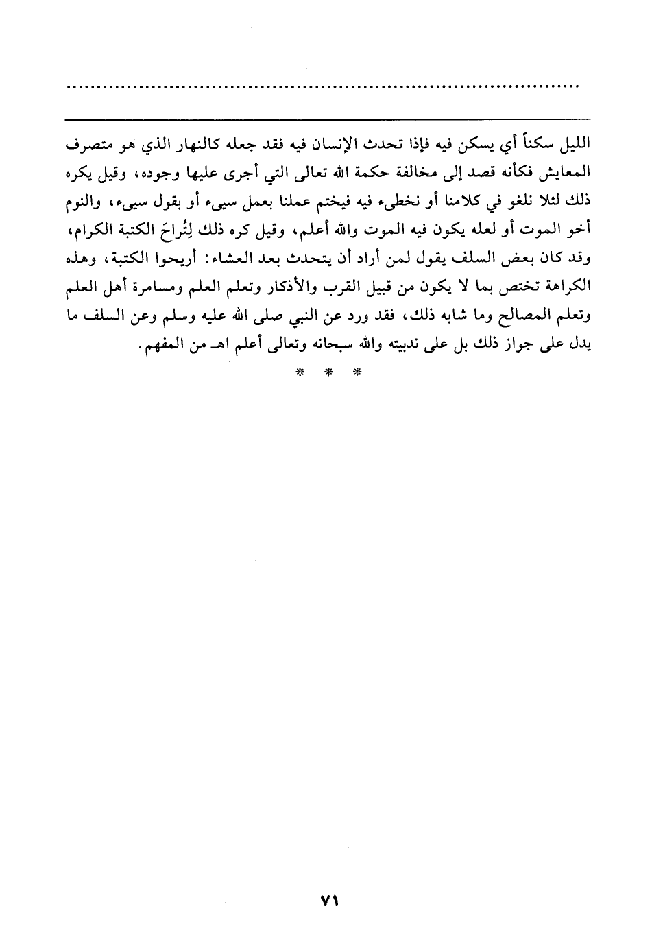 الليل سكنًا أي يسكن فيه فإذا تحدث الإنسان فيه فقد جعله كالنهار الذي هو متصرف المعايش فكأنه قصد إلى مخالفة حكمة الله تعالى التي أجرى عليها وجوده، وقيل يكره ذلك لئلا نلغوفي كلامنا أو نخطئ فيه فيختم عملنا بعمل سيئ أو بقول سيئ، والنوم أخو الموت أو لعله يكون فيه الموت والله أعلم، وقيل كره ذلك لِتُراحَ الكتبة الكرام، وقد كان بعض السلف يقول لمن أراد أن يتحدث بعد العشاء: أريحوا الكتبة، وهذه الكراهة تختص بما لا يكون من قبيل القرب والأذكار وتعلم العلم ومسامرة أهل العلم وتعلم المصالح وما شابه ذلك، فقد ورد عن النَّبيِّ صَلَّى الله عليه وسلم وعن السلف ما يدل على جواز ذلك بل على ندبيته والله سبحانه وتعالى أعلم اهـ من المفهم.