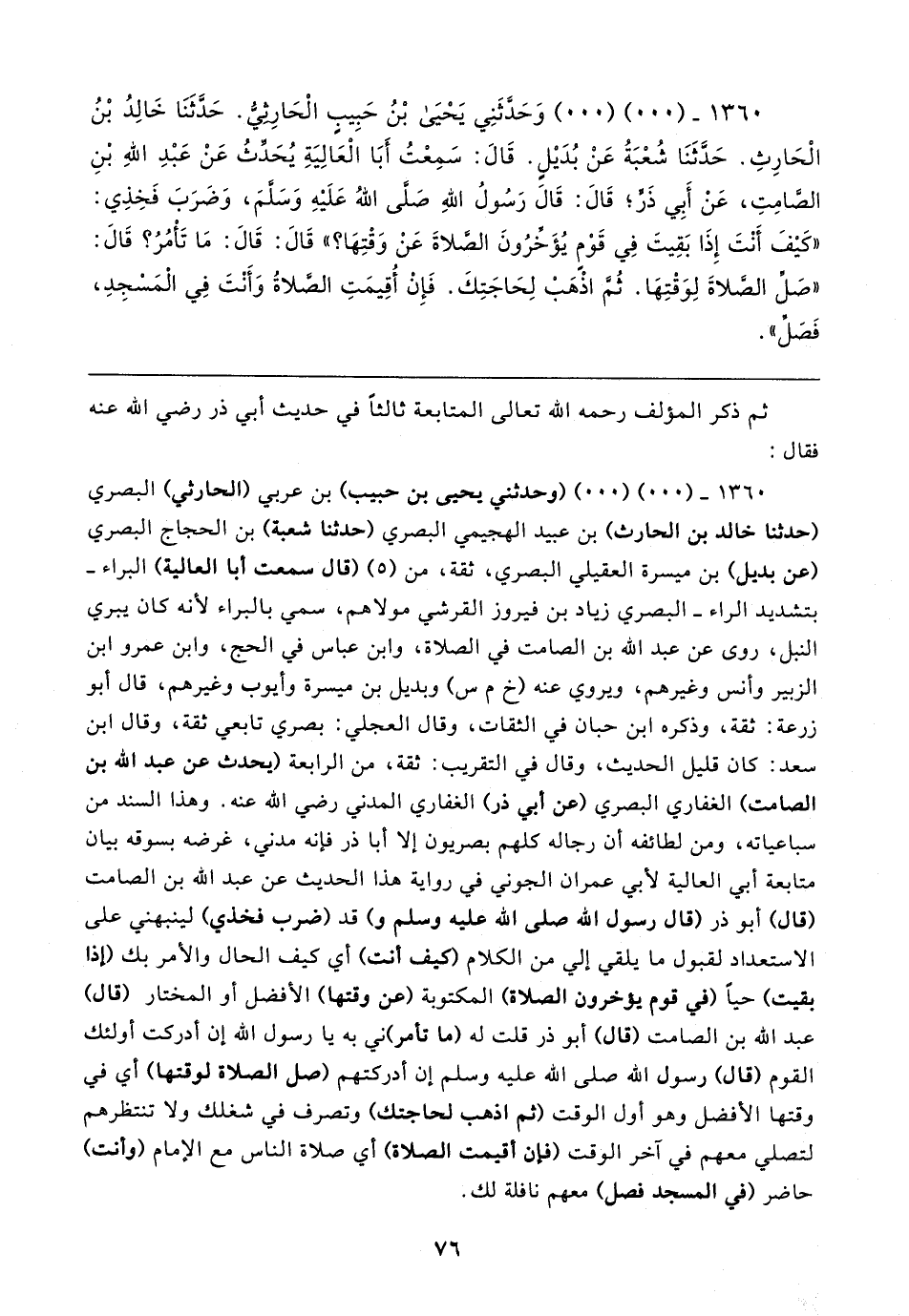 ١٣٦٠ - (٠٠) (٠٠) وَحَدَّثَنِي يَحْيَى بْنُ حَبِيبٍ الْحَارِثيُّ. حَدَّثَنَا خَالِدُ بْنُ الْحَارِثِ. حَدَّثَنَا شُعْبَةُ عَنْ بُدَيلٍ. قَال: سَمِعْتُ أَبَا الْعَالِيَةِ يُحَدِّثُ عَنْ عَبْدِ اللهِ بْنِ الصَّامِتِ، عَنْ أَبِي ذَرٍّ؛ قَال: قَال رَسُولُ اللهِ صَلَّى اللهُ عَلَيهِ وَسَلَّمَ، وَضَرَبَ فَخِذِي: "كَيفَ أَنْتَ إِذَا بَقِيتَ فِي قَوْمِ يُؤَخرُونَ الصَّلاةَ عَنْ وَقْتِهَا؟ " قَال: قَال: مَا تَأْمُرُ؟ قَال: "صَلِّ الصَّلاةَ لِوَقْتِهَا. ثُمَّ اذْهَبْ لِحَاجَتِكَ. فَإِنْ أُقِيمَتِ الصَّلاةُ وَأَنْتَ فِي الْمَسْجِدِ، فَصَلِّ"