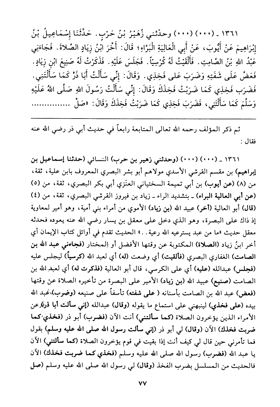 ١٣٦١ - (٠٠) (٠٠) وحدّثني زُهَيرُ بْنُ حَرْب. حَدَّثَنَا إِسْمَاعِيلُ بْنُ إِبْرَاهِيمَ عَنْ أَيوبَ، عَنْ أَبِي الْعَالِيَةِ الْبَرَّاءِ؛ قَال: أَخَّرَ ابْنُ زِيَادٍ الصَّلاةَ. فَجَاءَنِي عَبْدُ اللهِ بْنُ الصَّامِتِ. فَأَلْقَيتُ لَهُ كُرْسِيًّا. فَجَلَسَ عَلَيهِ. فَذَكَرْتُ لَهُ صَنِيعَ ابْنِ زِيادٍ. فَعضَّ عَلَى شَفَتِهِ وَضَرَبَ عَلى فَخِذِي. وَقَال: إِنِّي سَأَلْتُ أَبَا ذَرٍّ كَمَا سَأَلْتَنِي. فَضَرَب فَخِذِي كَمَا ضَرَبْتُ فَخِذَكَ وَقَال: إِنِّي سَأَلْتُ رَسُولَ اللهِ صَلَّى اللهُ عَلَيهِ وَسَلَّمَ كَمَا سَأَلْتَنِي، فَضَرَبَ فَخِذِي كَمَا ضَرَبْتُ فَخِذَكَ وَقَال: "صَلِّ
