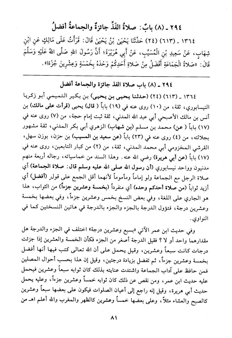 ٢٩٤ - (٨) باب صلاة الفذِّ جائزة والجماعة أفضل