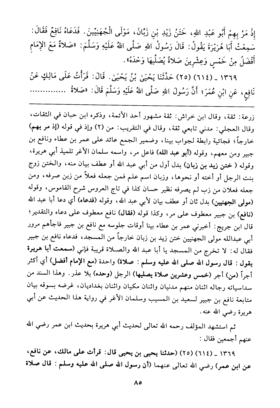إِذْ مَرّ بِهِمْ أَبُو عَبْدِ اللهِ، خَتَنُ زَيدِ بْنِ زَبَّانَ، مَوْلَى الْجُهَنِيِّينَ. فَدَعَاهُ نَافِعٌ فَقَال: سَمِعْتُ أَبَا هُرَيرَةَ يَقُولُ: قَال رَسُولُ اللهِ صَلَّى اللهُ عَلَيهِ وَسَلَّمَ: "صَلاةٌ مَعَ الإِمَامِ أَفْضَلُ مِنْ خَمسٍ وَعِشْرِينَ صَلاة يُصَلِّيهَا وَحْدَهُ".