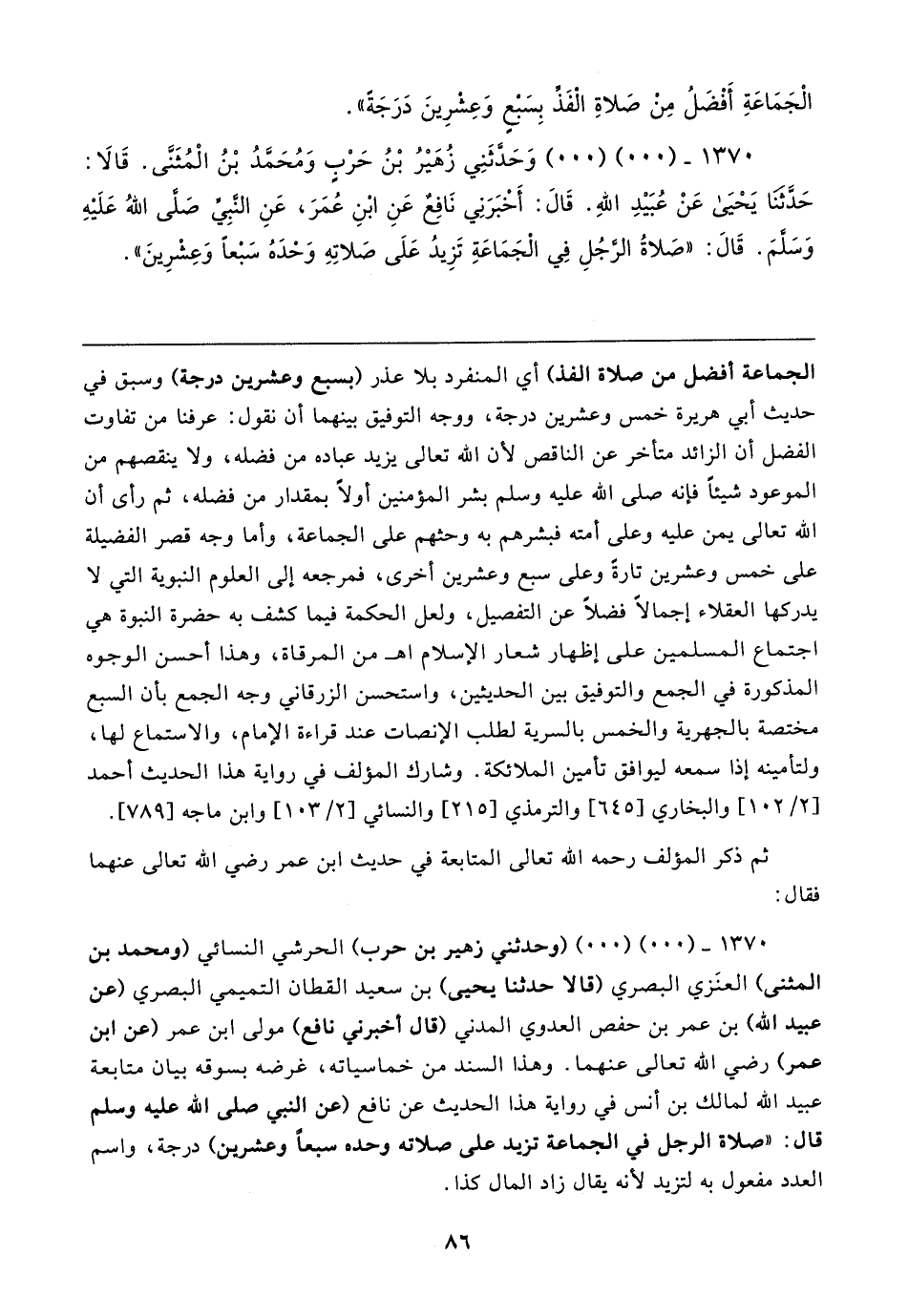 ١٣٧٠ - (٠٠) (٠٠) (وحدثني زهير بن حرب) الحرشي النَّسائيّ (ومحمد بن المثني) العنَزي البصري (قالا حدَّثنا يَحْيَى) بن سعيد القطان التميمي البصري (عن عبيد الله) بن عمر بن حفص العدوي المدني (قال أخبرني نافع) مولى ابن عمر (عن ابن عمر) رضي الله تعالى عنهما. وهذا السند من خماسياته، غرضه بسوقه بيان متابعة عبيد الله لمالك بن أنس في رواية هذا الحديث عن نافع (عن النَّبيِّ صَلَّى الله عليه وسلم قال: "صلاة الرجل في الجماعة تزيد على صلاته وحده سبعًا وعشرين) درجة، واسم العدد مفعول به لتزيد لأنَّه يقال زاد المال كذا.