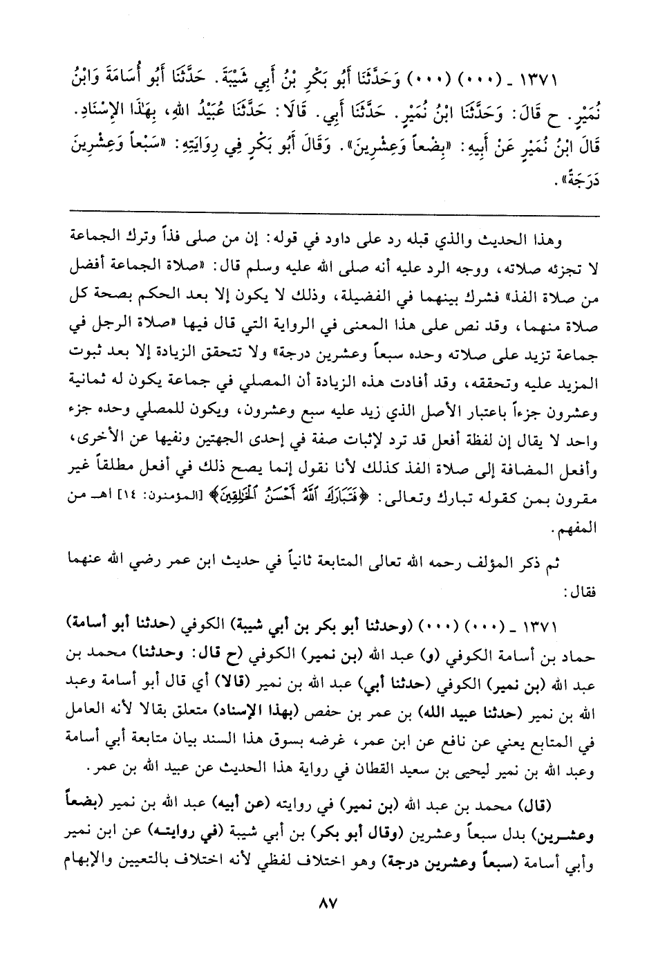 ١٣٧١ - (٠٠) (٠٠) وَحَدَّثَنَا أبُو بَكْرِ بْنُ أبِي شَيبَةَ. حَدَّثنَا أَبُو أسَامَةَ وَابْنُ نُمَيرٍ. ح قَال: وَحَدَّثنَا ابْنُ نُمَير. حَدَّثَنَا أَبِي. قَالا: حَدَّثَنَا عُبَيدُ اللهِ، بِهذَا الإِسْنَادِ. قَال ابْنُ نُمَيرٍ عَنْ أَبِيهِ: "بِضْعًا وَعِشْرِينَ". وَقَال أبُو بَكْرِ فِي رِوَايَتِهِ: "سَبْعًا وَعِشْرِينَ دَرَجَة"