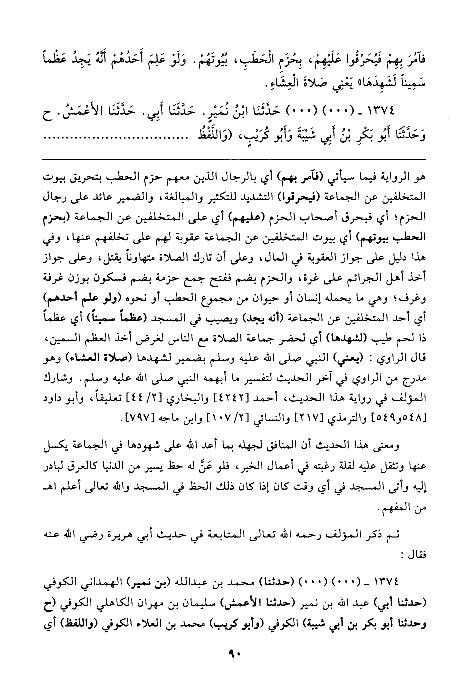 هو الرِّواية فيما سيأتي (فآمر بهم) أي بالرجال الذين معهم حزم الحطب بتحريق بيوت المتخلفين عن الجماعة (فيحرقوا) التشديد للتكثير والمبالغة، والضمير عائد على رجال الحزم؛ أي فيحرق أصحاب الحزم (عليهم) أي على المتخلفين عن الجماعة (بحزم الحطب بيوتهم) أي بيوت المتخلفين عن الجماعة عقوبة لهم على تخلفهم عنها، وفي هذا دليل على جواز العقوبة في المال، وعلى أن تارك الصَّلاة متهاونًا يقتل، وعلى جواز أخذ أهل الجرائم على غرة، والحزم بضم ففتح جمع حزمة بضم فسكون بوزن غرفة وغرف؛ وهي ما يحمله إنسان أو حيوان من مجموع الخطيب أو نحوه (ولو علم أحدهم) أي أحد المتخلفين عن الجماعة (أنَّه يجد) ويصيب في المسجد (عظمًا يمينًا) أي عظمًا ذا لحم طيب (لشهدها) أي لحضر جماعة الصَّلاة مع النَّاس لغرض أخذ العظم السمين، قال الراوي: (يعني) النَّبيُّ صَلَّى الله عليه وسلم بضمير لشهدها (صلاة العشاء) وهو مدرج من الراوي في آخر الحديث لتفسير ما أبهمه النَّبيُّ صَلَّى الله عليه وسلم. وشارك المؤلف في رواية هذا الحديث، أحمد [٤٢٤٢] والبخاري [٢/ ٤٤] تعليقًا، وأبو داود [٥٤٨ و ٥٤٩] والترمذي [٢١٧] والنَّسائيُّ [٢/ ١٠٧] وابن ماجة [٧٩٧].