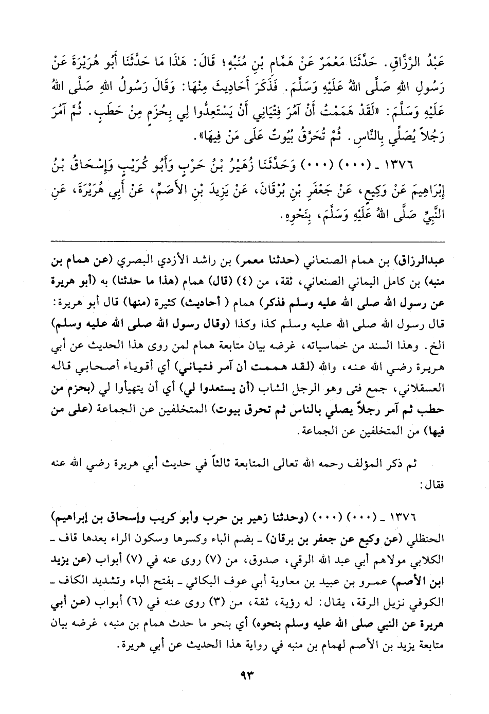 عَبْدُ الرَّزاقِ. حَدَّثَنَا مَعْمَرٌ عَنْ هَمَّامِ بْنِ مُنَبِّهٍ؛ قَال: هَذَا مَا حَدَّثَنَا أَبُو هُرَيرَةَ عَنْ رَسُولِ اللهِ صَلَّى اللهُ عَلَيهِ وَسَلَّمَ. فَذَكَرَ أَحَادِيثَ مِنْهَا: وَقَال رَسُولُ اللهِ صَلَّى اللهُ عَلَيهِ وَسَلَّمَ: "لَقَد هَمَمْتُ أَنْ آمُرَ فِتْيَانِي أَنْ يَسْتَعِدُّوا لِي بِحُزَمٍ مِنْ حَطَبٍ. ثُمَّ آمُرَ رَجُلًا يُصَلِّي بِالنَّاسِ. ثُمَّ تُحَرَّقُ بُيُوت عَلَى مَنْ فِيهَا".