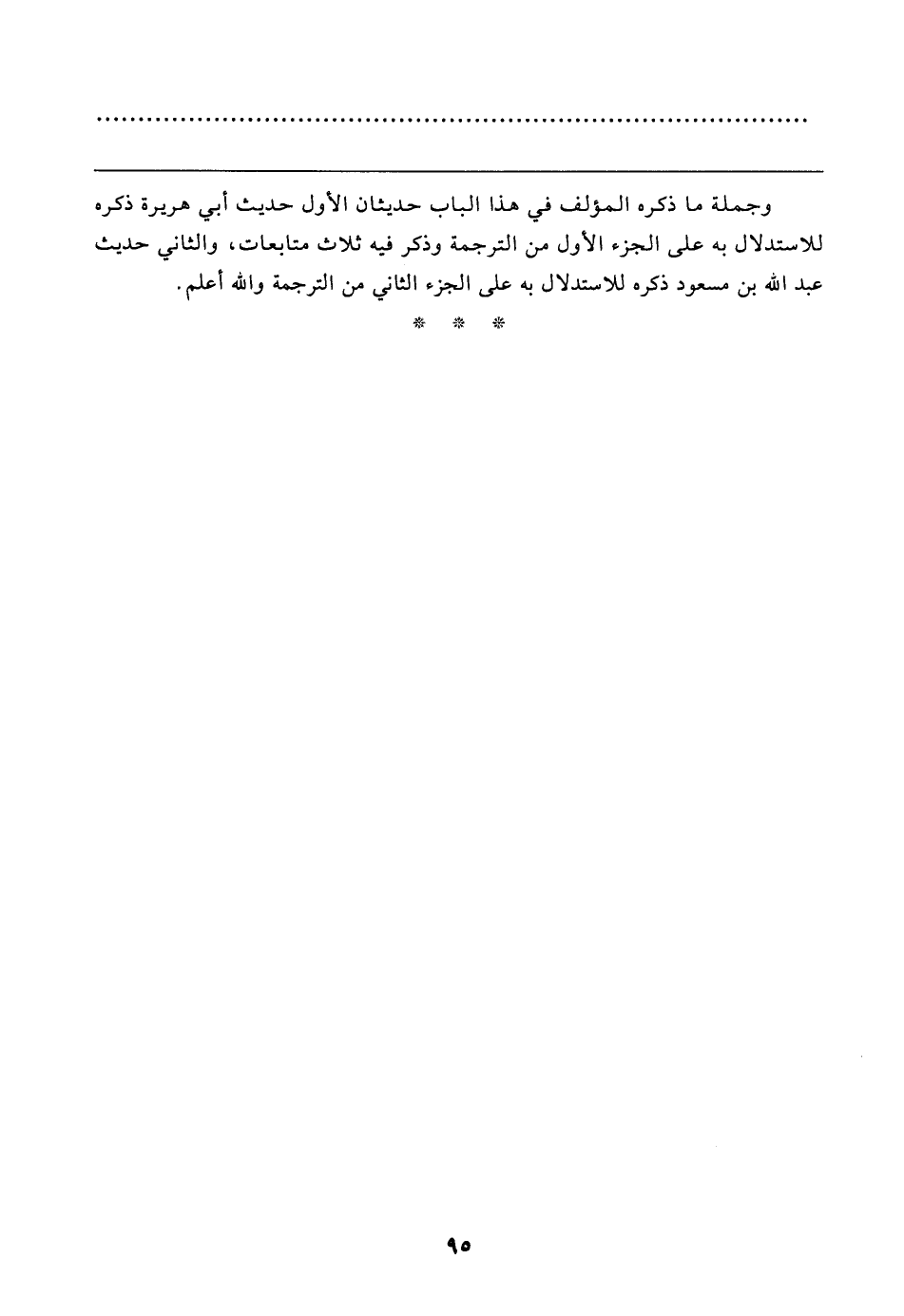 وجملة ما ذكره المؤلف في هذا الباب حديثان الأوَّل حديث أبي هريرة ذكره للاستدلال به على الجزء الأوَّل من الترجمة وذكر فيه ثلاث متابعات، والثَّاني حديث عبد الله بن مسعود ذكره للاستدلال به على الجزء الثَّاني من الترجمة والله أعلم.