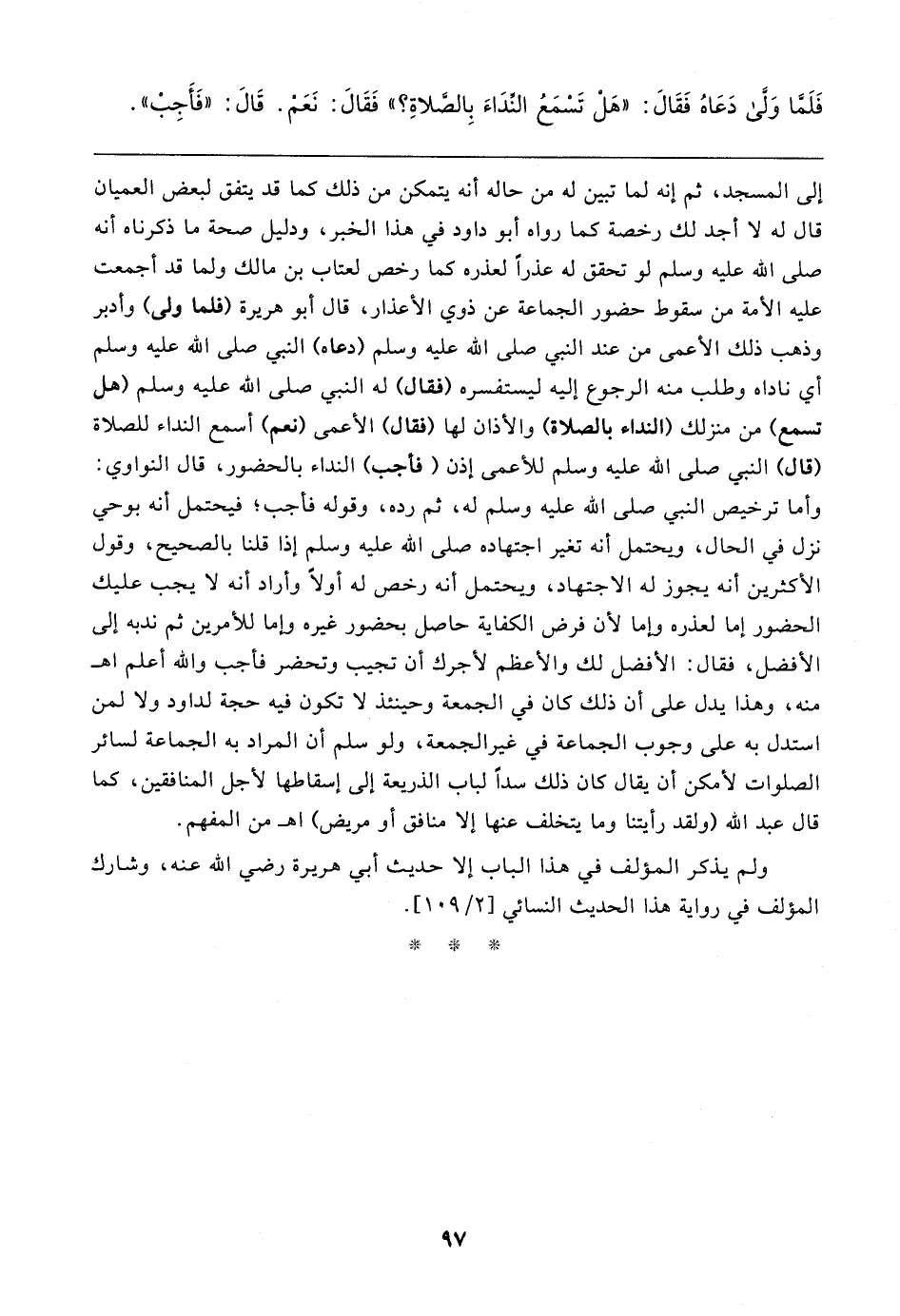إلى المسجد، ثم إنَّه لما تبيّن له من حاله أنَّه يتمكن من ذلك كما قد يتفق لبعض العميان قال له لا أجد لك رخصة كما رواه أبو داود في هذا الخبر، ودليل صحة ما ذكرناه أنَّه صَلَّى الله عليه وسلم لو تحقق له عذرًا لعذره كما رخص لعتاب بن مالك ولما قد أجمعت عليه الأمة من سقوط حضور الجماعة عن ذوي الأعذار، قال أبو هريرة (فلما ولى) وأدبر وذهب ذلك الأعمى من عند النَّبيِّ صَلَّى الله عليه وسلم (دعاه) النَّبي صَلَّى الله عليه وسلم أي ناداه وطلب منه الرجوع إليه ليستفسره (فقال) له النَّبيُّ صَلَّى الله عليه وسلم (هل تسمع) من منزلك (النداء بالصلاة) والأذان لها (فقال) الأعمى (نعم) أسمع النداء للصلاة (قال) النَّبيُّ صَلَّى الله عليه وسلم للأعمى إذن (فأجب) النداء بالحضور، قال النواوي: وأمَّا ترخيص النَّبيِّ صَلَّى الله عليه وسلم له، ثم رده، وقوله فأجب؛ فيحتمل أنَّه بوحي نزل في الحال، ويحتمل أنَّه تغير اجتهاده صَلَّى الله عليه وسلم إذا قلنا بالصحيح؛ وقول الأكثرين أنَّه يجوز له الاجتهاد، ويحتمل أنَّه رخص له أولًا وأراد أنَّه لا يجب عليك الحضور إمَّا لعذره وإما لأن فرض الكفاية حاصل بحضور غيره وإما للأمرين ثم ندبه إلى الأفضل، فقال: الأفضل لك والأعظم لأجرك أن تجيب وتحضر فأجب والله أعلم أن منه، وهذا يدل على أن ذلك كان في الجمعة وحينئذ لا تكون فيه حجة لداود ولا لمن استدل به على وجوب الجماعة في غير الجمعة، ولو سلم أن المراد به الجماعة لسائر الصلوات لأمكن أن يقال كان ذلك سدًا لباب الذريعة إلى إسقاطها لأجل المنافقين، كما قال عبد الله (ولقد رأيتنا وما يتخلف عنها إلَّا منافق أو مريض) اهـ من المفهم.