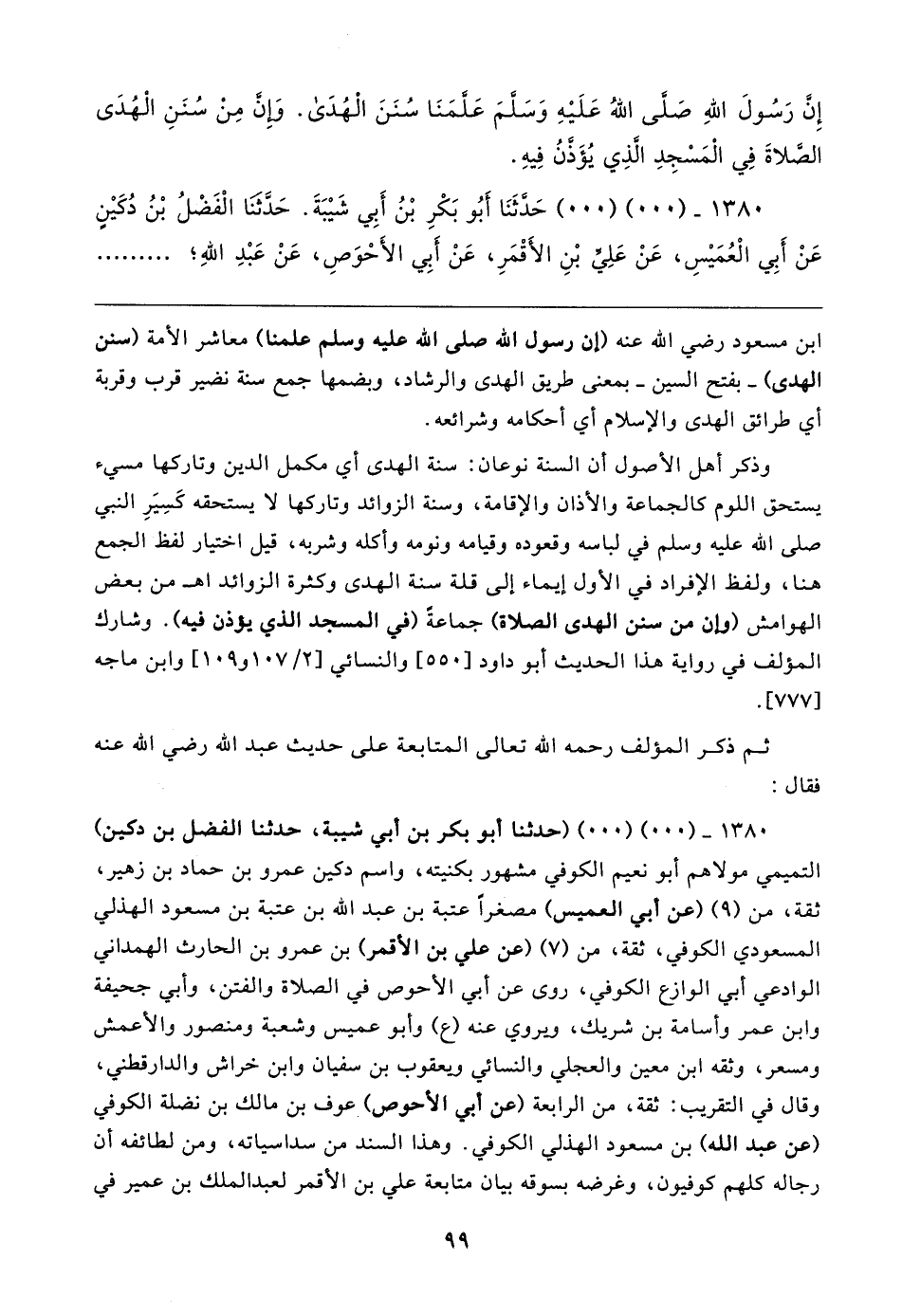 ١٣٨٠ - (٠٠) (٠٠) (حدَّثنا أبو بكر بن أبي شيبة، حدَّثنا الفضل بن دكين) التميمي مولاهم أبو نعيم الكوفيّ مشهور بكنيته، واسم دكين عمرو بن حماد بن زهير، ثقة، من (٩) (عن أبي العميس) مصغرًا عتبة بن عبد الله بن عتبة بن مسعود الهذلي المسعودي الكوفيّ، ثقة، من (٧) (عن علي بن الأقمر) بن عمرو بن الحارث الهمداني الوادعي أبي الوازع الكوفيّ، روى عن أبي الأحوص في الصَّلاة والفتن، وأبي جحيفة وابن عمر وأسامة بن شريك، ويروي عنه (ع) وأبو عميس وشعبة ومنصور والأعمش ومسعر، وثقه ابن معين والعجليّ والنَّسائيُّ ويعقوب بن سفيان وابن خراش والدارقطني، وقال في التقريب: ثقة، من الرابعة (عن أبي الأحوص) عوف بن مالك بن نضلة الكوفيّ (عن عبد الله) بن مسعود الهذلي الكوفيّ. وهذا السند من سداسياته، ومن لطائفه أن رجاله كلهم كوفيون، وغرضه بسوقه بيان متابعة علي بن الأقمر لعبد الملك بن عمير في