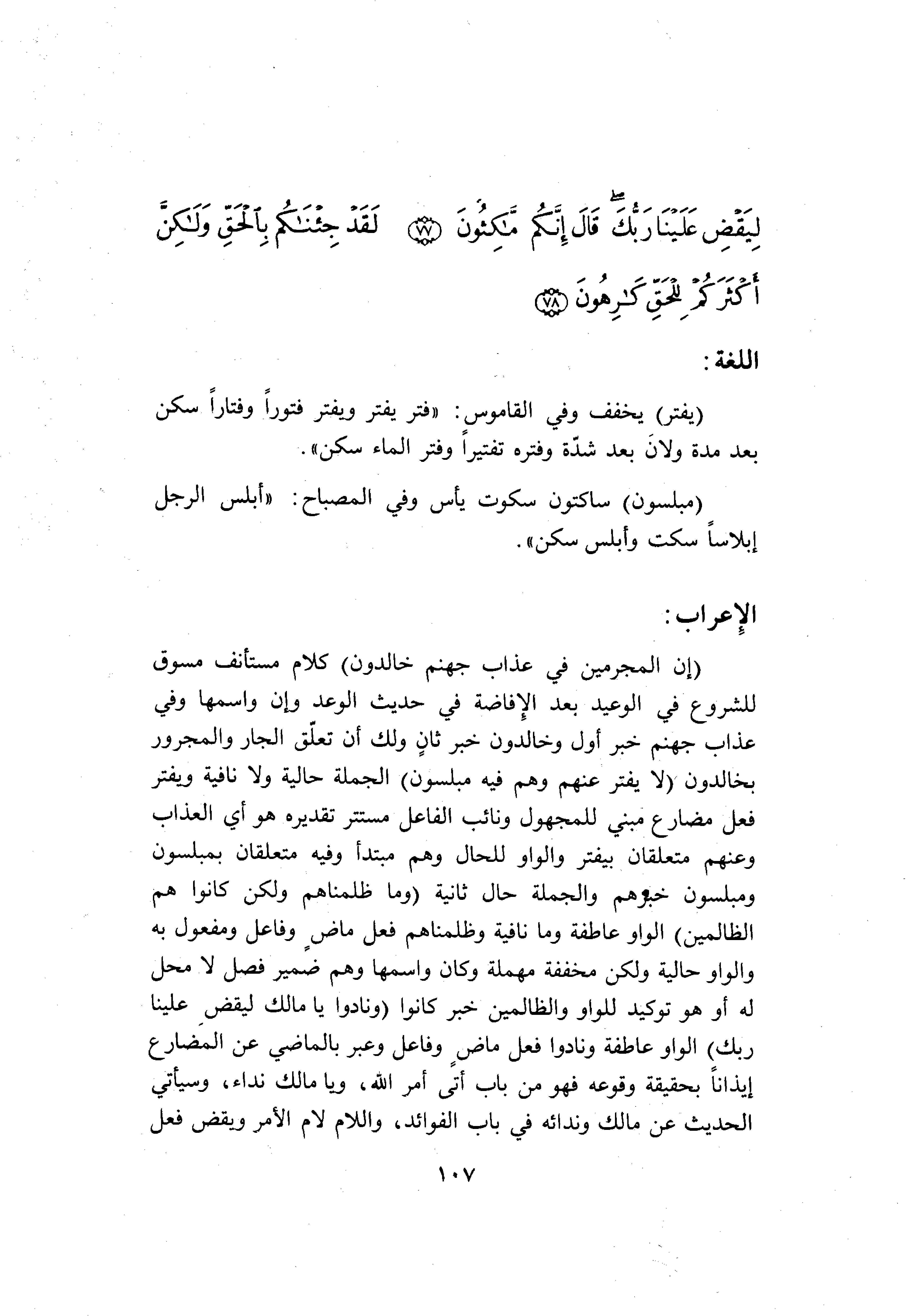 (إِنَّ الْمُجْرِمِينَ فِي عَذابِ جَهَنَّمَ خالِدُونَ) كلام مستأنف مسوق للشروع في الوعيد بعد الإفاضة في حديث الوعد وإن واسمها وفي عذاب جهنم خبر أول وخالدون خبر ثان ولك أن تعلّق الجار والمجرور بخالدون (لا يُفَتَّرُ عَنْهُمْ وَهُمْ فِيهِ مُبْلِسُونَ) الجملة حالية ولا نافية ويفتر فعل مضارع مبني للمجهول ونائب الفاعل مستتر تقديره هو أي العذاب وعنهم متعلقان بيفتر والواو للحال وهم مبتدأ وفيه متعلقان بمبلسون ومبلسون خبرهم والجملة حال ثانية (وَما ظَلَمْناهُمْ وَلكِنْ كانُوا هُمُ الظَّالِمِينَ) الواو عاطفة وما نافية وظلمناهم فعل ماض وفاعل ومفعول به والواو حالية ولكن مخففة مهملة وكان واسمها وهم ضمير فصل لا محل له أو هو توكيد للواو والظالمين خبر كانوا (وَنادَوْا يا مالِكُ لِيَقْضِ عَلَيْنا رَبُّكَ) الواو عاطفة ونادوا فعل ماض وفاعل وعبر بالماضي عن المضارع إيذانا بحقيقة وقوعه فهو من باب أتى أمر الله، ويا مالك نداء، وسيأتي الحديث عن مالك وندائه في باب الفوائد، واللام لام الأمر ويقض فعل