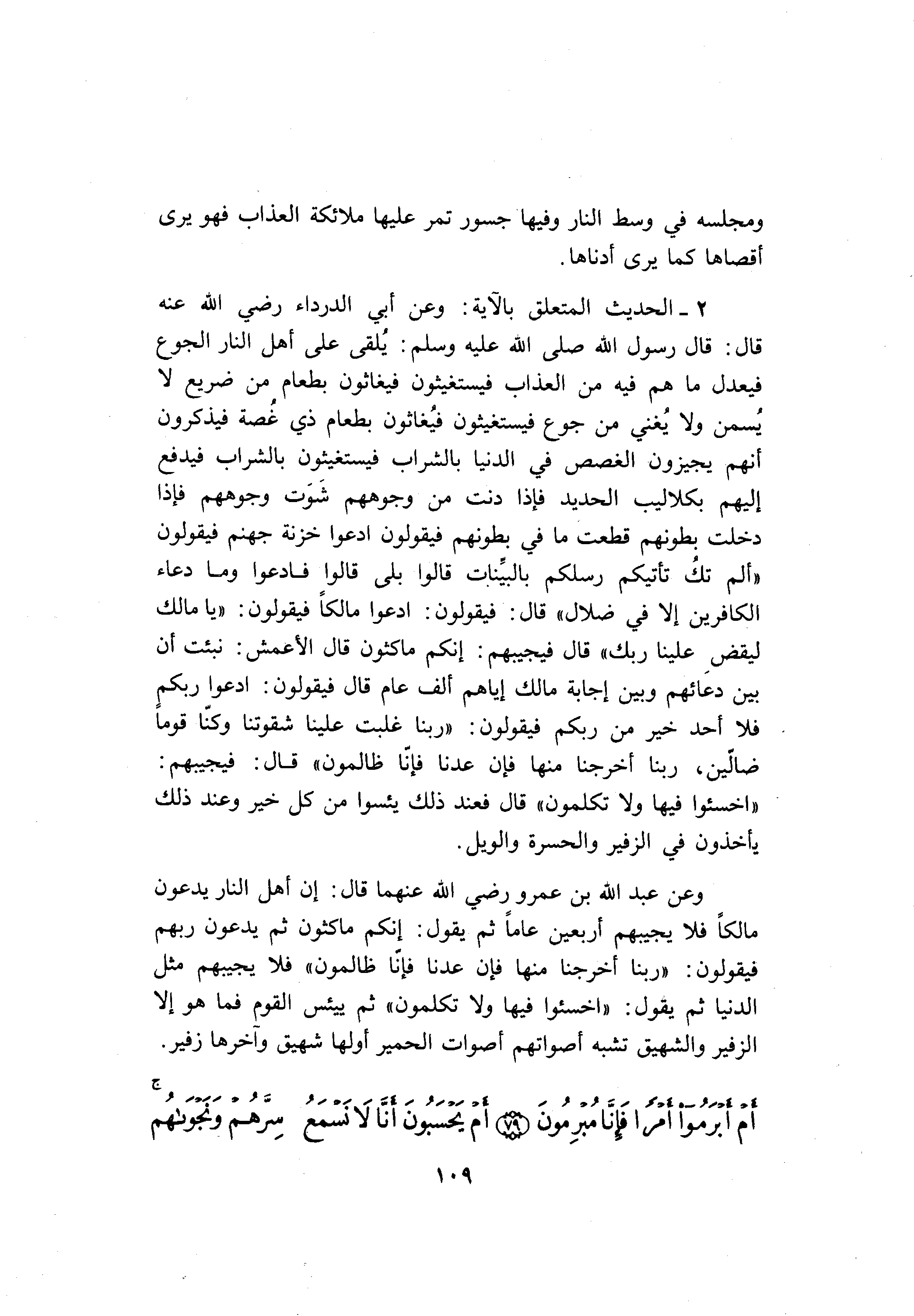وعن عبد الله بن عمرو رضي الله عنهما قال: إنّ أهل النار يدعون مالكا فلا يجيبهم أربعين عاما ثم يقول: إنكم ماكثون ثم يدعون ربهم فيقولون: «ربنا أخرجنا منها فإن عدنا فإنّا ظالمون» فلا يجيبهم مثل الدنيا ثم يقول: «اخسئوا فيها ولا تكلمون» ثم ييئس القوم فما هو إلا الزفير والشهيق تشبه أصواتهم أصوات الحمير أولها شهيق وآخرها زفير.