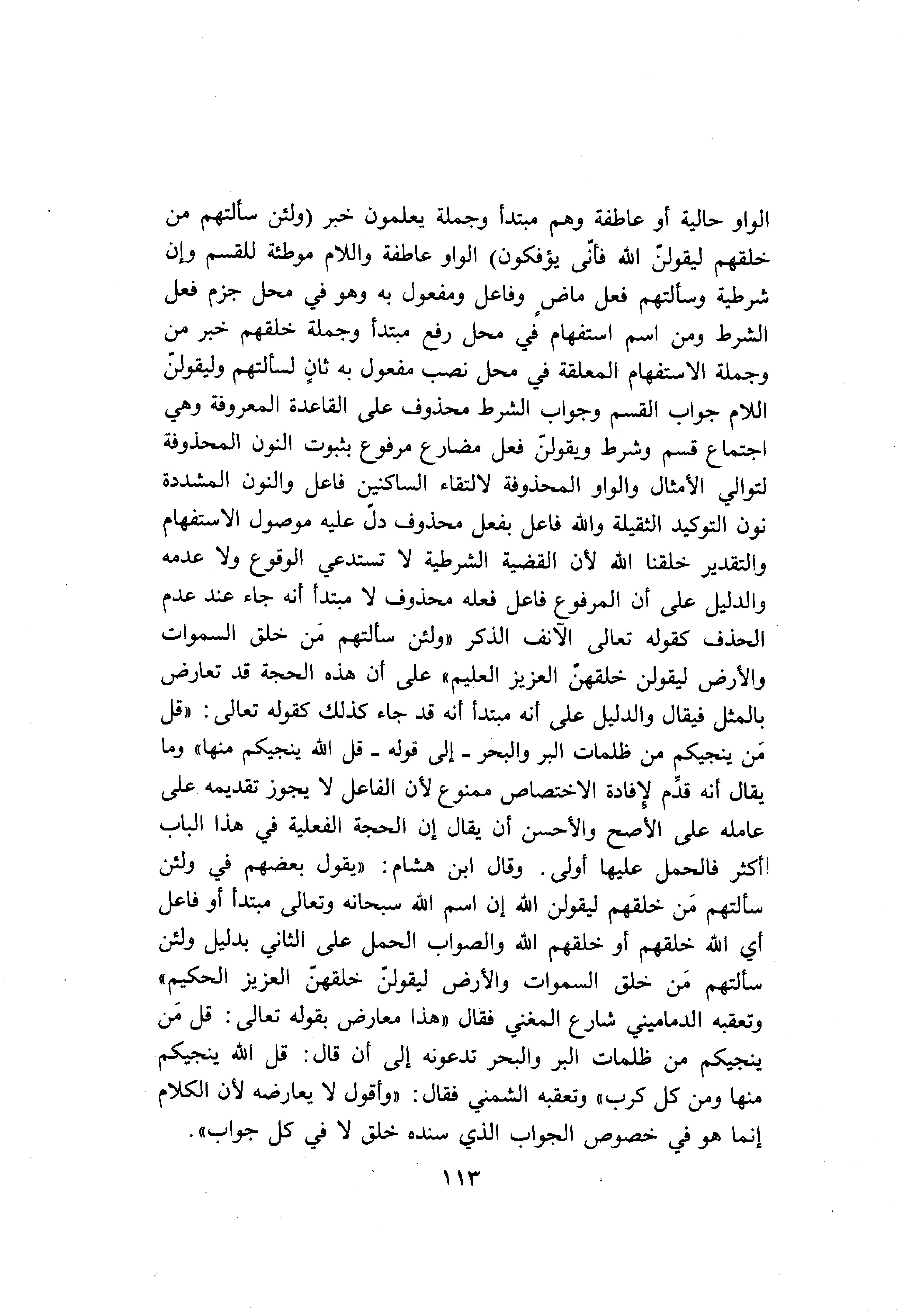 الواو حالية أو عاطفة وهم مبتدأ وجملة يعلمون خبر (وَلَئِنْ سَأَلْتَهُمْ مَنْ خَلَقَهُمْ لَيَقُولُنَّ اللَّهُ فَأَنَّى يُؤْفَكُونَ) الواو عاطفة واللام موطئة للقسم وإن شرطية وسألتهم فعل ماض وفاعل ومفعول به وهو في محل جزم فعل الشرط ومن اسم استفهام في محل رفع مبتدأ وجملة خلقهم خبر من وجملة الاستفهام المعلقة في محل نصب مفعول به ثان لسألتهم وليقولنّ اللام جواب القسم وجواب الشرط محذوف على القاعدة المعروفة وهي اجتماع قسم وشرط ويقولنّ فعل مضارع مرفوع بثبوت النون المحذوفة لتوالي الأمثال والواو المحذوفة لالتقاء الساكنين فاعل والنون المشددة نون التوكيد الثقيلة والله فاعل بفعل محذوف دلّ عليه موصول الاستفهام والتقدير خلقنا الله لأن القضية الشرطية لا تستدعي الوقوع ولا عدمه والدليل على أن المرفوع فاعل فعله محذوف لا مبتدأ أنه جاء عند عدم الحذف كقوله تعالى الآنف الذكر «ولئن سألتهم من خلق السموات والأرض ليقولن خلقهنّ العزيز العليم» على أن هذه الحجة قد تعارض بالمثل فيقال والدليل على أنه مبتدأ أنه قد جاء كذلك كقوله تعالى: «قل من ينجيكم من ظلمات البر والبحر- إلى قوله- قل الله ينجيكم منها» وما يقال أنه قدّم لإفادة الاختصاص ممنوع لأن الفاعل لا يجوز تقديمه على عامله على الأصح والأحسن أن يقال إن الحجة الفعلية في هذا الباب أكثر فالحمل عليها أولى. وقال ابن هشام: «يقول بعضهم في ولئن سألتهم من خلقهم ليقولن الله إن اسم الله سبحانه وتعالى مبتدأ أو فاعل أي الله خلقهم أو خلقهم الله والصواب الحمل على الثاني بدليل ولئن سألتهم من خلق السموات والأرض ليقولنّ خلقهنّ العزيز الحكيم» وتعقبه الدماميني شارع المغني فقال «هذا معارض بقوله تعالى: قل من ينجيكم من ظلمات البر والبحر تدعونه إلى أن قال: قل الله ينجيكم منها ومن كل كرب» وتعقبه الشمني فقال: «وأقول لا يعارضه لأن الكلام إنما هو في خصوص الجواب الذي سنده خلق لا في كل جواب» .