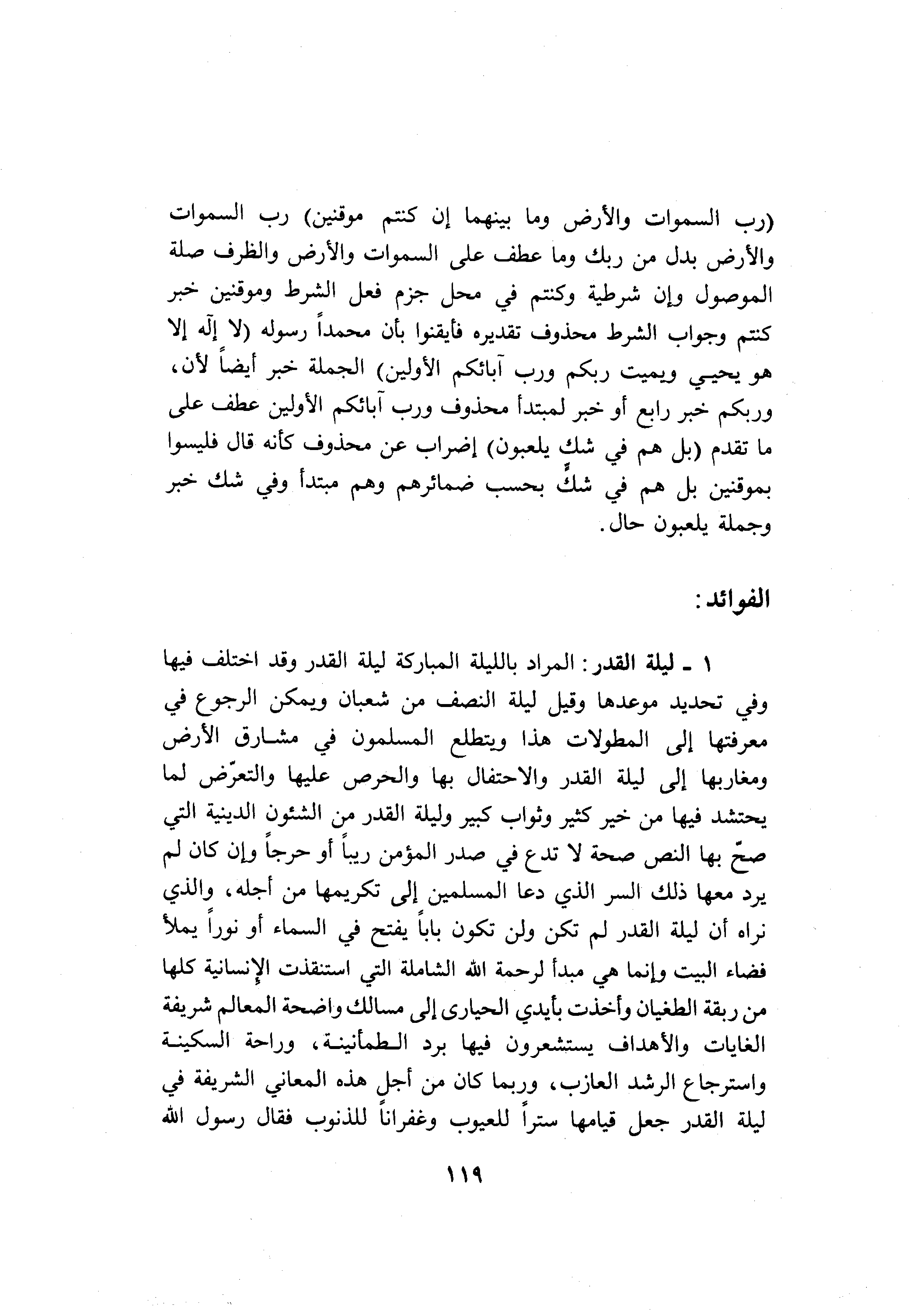 1- ليلة القدر: المراد بالليلة المباركة ليلة القدر وقد اختلف فيها وفي تحديد موعدها وقيل ليلة النصف من شعبان ويمكن الرجوع في معرفتها إلى المطولات هذا ويتطلع المسلمون في مشارق الأرض ومغاربها إلى ليلة القدر والاحتفال بها والحرص عليها والتعرّض لما يحتشد فيها من خير كثير وثواب كبير وليلة القدر من الشئون الدينية التي صحّ بها النص صحة لا تدع في صدر المؤمن ريبا أو حرجا وإن كان لم يرد معها ذلك السر الذي دعا المسلمين إلى تكريمها من أجله، والذي نراه أن ليلة القدر لم تكن ولن تكون بابا يفتح في السماء أو نورا يملأ فضاء البيت وإنما هي مبدأ لرحمة الله الشاملة التي استنفذت الإنسانية كلها من ربقة الطغيان وأخذت بأيدي الحيارى إلى مسالك واضحة المعالم شريفة الغايات والأهداف يستشعرون فيها برد الطمأنينة، وراحة السكينة واسترجاع الرشد العازب، وربما كان من أجل هذه المعاني الشريفة في ليلة القدر جعل قيامها سترا للعيوب وغفرانا للذنوب فقال رسول الله