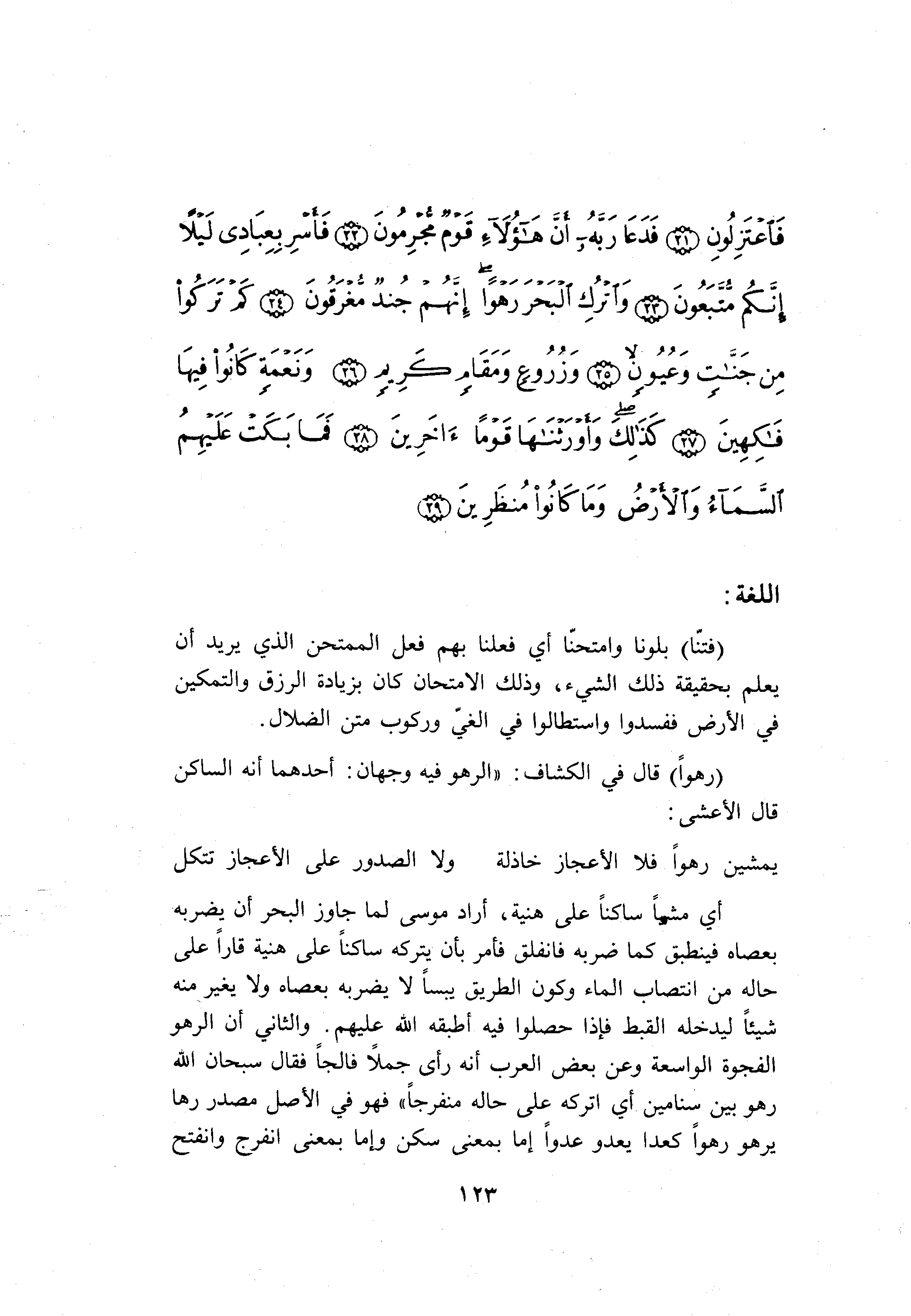 أي مشيا ساكنا على هنية، أراد موسى لما جاوز البحر أن يضربه بعصاه فينطبق كما ضربه فانفلق فأمر بأن يتركه ساكنا على هنية قارا على حاله من انتصاب الماء وكون الطريق يبسا لا يضربه بعصاه ولا يغير منه شيئا ليدخله القبط فإذا حصلوا فيه أطبقه الله عليهم. والثاني أن الرهو الفجوة الواسعة وعن بعض العرب أنه رأى جملا فالجا فقال سبحان الله رهو بين سنامين أي اتركه على حاله منفرجا» فهو في الأصل مصدر رها يرهو رهوا كعدا يعدو عدوا إما بمعنى سكن وإما بمعنى انفرج وانفتح