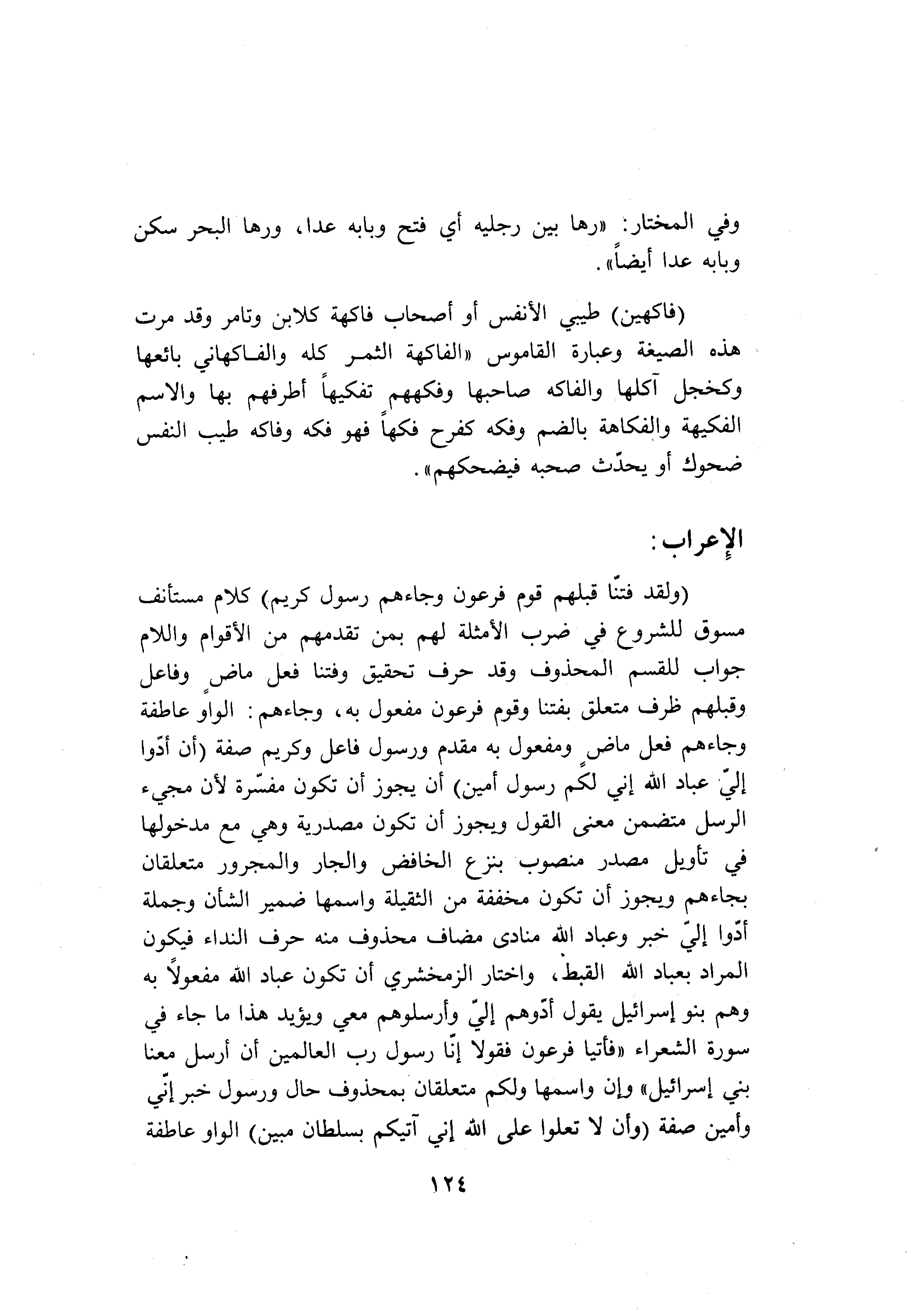 (وَلَقَدْ فَتَنَّا قَبْلَهُمْ قَوْمَ فِرْعَوْنَ وَجاءَهُمْ رَسُولٌ كَرِيمٌ) كلام مستأنف مسوق للشروع في ضرب الأمثلة لهم بمن تقدمهم من الأقوام واللام جواب للقسم المحذوف وقد حرف تحقيق وفتنا فعل ماض وفاعل وقبلهم ظرف متعلق بفتنا وقوم فرعون مفعول به، وجاءهم: الواو عاطفة وجاءهم فعل ماض ومفعول به مقدم ورسول فاعل وكريم صفة (أَنْ أَدُّوا إِلَيَّ عِبادَ اللَّهِ إِنِّي لَكُمْ رَسُولٌ أَمِينٌ) أن يجوز أن تكون مفسّرة لأن مجيء الرسل متضمن معنى القول ويجوز أن تكون مصدرية وهي مع مدخولها في تأويل مصدر منصوب بنزع الخافض والجار والمجرور متعلقان بجاءهم ويجوز أن تكون مخففة من الثقيلة واسمها ضمير الشأن وجملة أدّوا إليّ خبر وعباد الله منادى مضاف محذوف منه حرف النداء فيكون المراد بعباد الله القبط، واختار الزمخشري أن تكون عباد الله مفعولا به وهم بنو إسرائيل يقول أدّوهم إليّ وأرسلوهم معي ويؤيد هذا ما جاء في سورة الشعراء «فأتيا فرعون فقولا إنّا رسول رب العالمين أن أرسل معنا بني إسرائيل» وإن واسمها ولكم متعلقان بمحذوف حال ورسول خبر إنّي وأمين صفة (وَأَنْ لا تَعْلُوا عَلَى اللَّهِ إِنِّي آتِيكُمْ بِسُلْطانٍ مُبِينٍ) الواو عاطفة