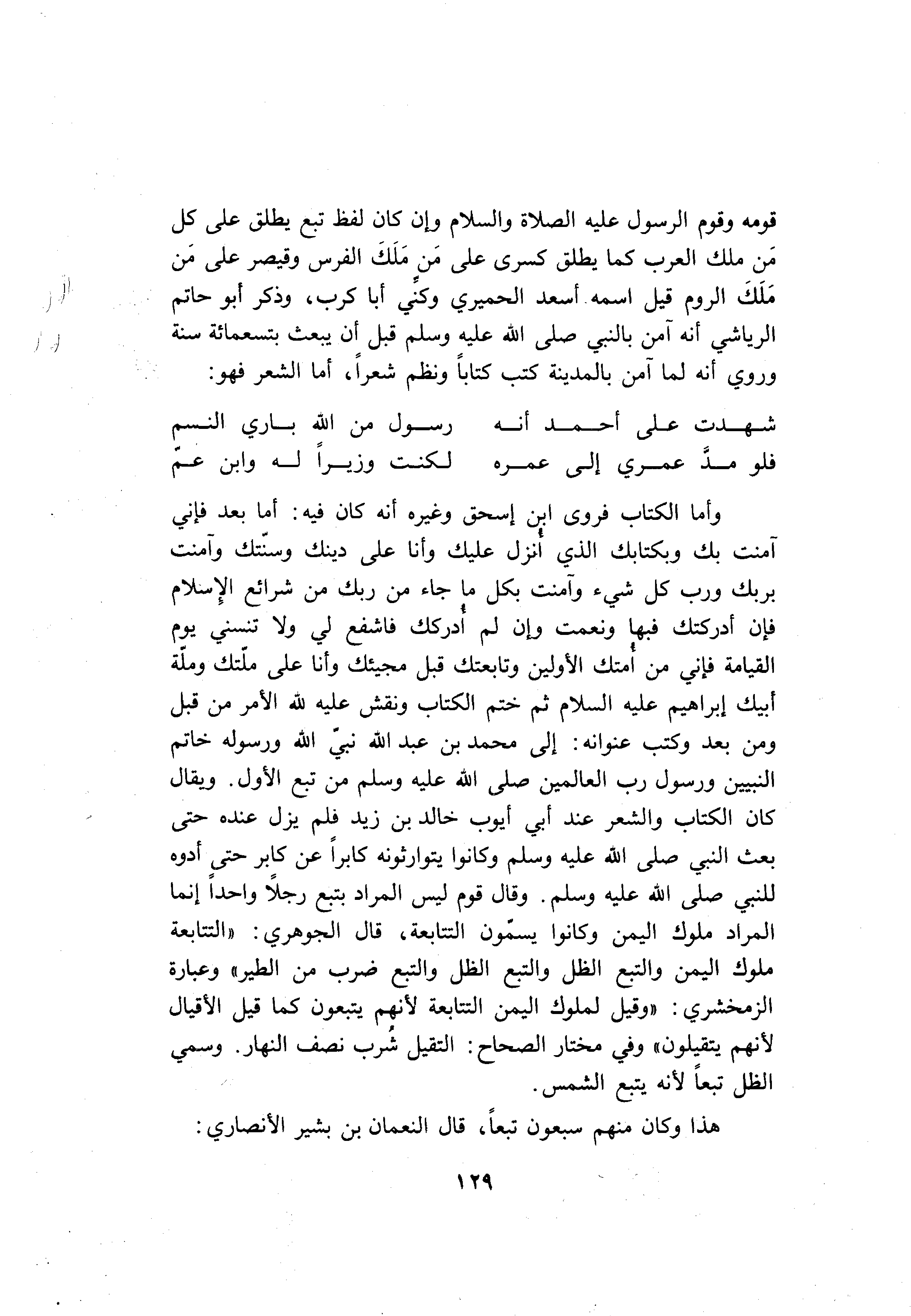 وأما الكتاب فروى ابن إسحق وغيره أنه كان فيه: أما بعد فإني آمنت بك وبكتابك الذي أنزل عليك وأنا على دينك وسنّتك وآمنت بربك ورب كل شيء وآمنت بكل ما جاء من ربك من شرائع الإسلام فإن أدركتك فبها ونعمت وإن لم أدركك فاشفع لي ولا تنسني يوم القيامة فإني من أمتك الأولين وتابعتك قبل مجيئك وأنا على ملّتك وملّة أبيك إبراهيم عليه السّلام ثم ختم الكتاب ونقش عليه لله الأمر من قبل ومن بعد وكتب عنوانه: إلى محمد بن عبد الله نبيّ الله ورسوله خاتم النبيين ورسول رب العالمين صلى الله عليه وسلم من تبع الأول. ويقال كان الكتاب والشعر عند أبي أيوب خالد بن زيد فلم يزل عنده حتى بعث النبي صلى الله عليه وسلم. وكانوا يتوارثونه كابرا عن كابر حتى أدوه للنبي صلى الله عليه وسلم. وقال قوم ليس المراد بتبع رجلا واحدا إنما المراد ملوك اليمن وكانوا يسمّون التتابعة، قال الجوهري: «التتابعة ملوك اليمن والتبع الظل والتبع الظل والتبع ضرب من الطير» وعبارة الزمخشري: «وقيل لملوك اليمن التتابعة لأنهم يتبعون كما قيل الأقيال لأنهم يتقيلون» وفي مختار الصحاح: التقيل شرب نصف النهار. وسمي الظل تبعا لأنه يتبع الشمس.