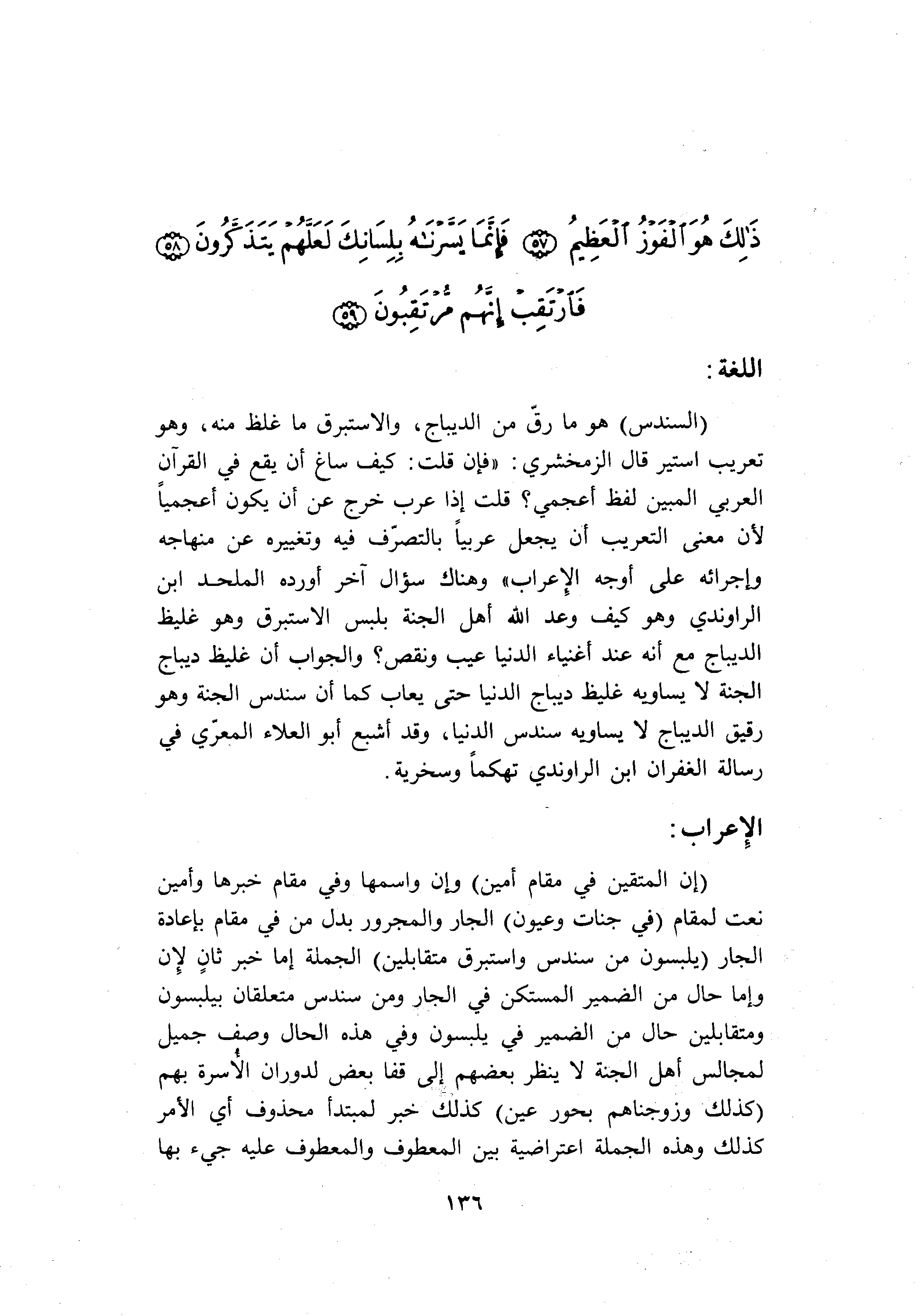 (السندس) هو ما رقّ من الديباج، والإستبرق ما غلظ منه، وهو تعريب استير قال الزمخشري: «فإن قلت: كيف ساغ أن يقع في القرآن العربي المبين لفظ أعجمي؟ قلت إذا عرب خرج عن أن يكون أعجميا لأن معنى التعريب أن يجعل عربيا بالتصرّف فيه وتغييره عن منهاجه وإجرائه على أوجه الإعراب» وهناك سؤال آخر أورده الملحد ابن الراوندي وهو كيف وعد الله أهل الجنة بلبس الإستبرق وهو غليظ الديباج مع أنه عند أغنياء الدنيا عيب ونقص؟ والجواب أن غليظ ديباج الجنة لا يساويه غليظ ديباج الدنيا حتى يعاب كما أن سندس الجنة وهو رقيق الديباج لا يساويه سندس الدنيا، وقد أشبع أبو العلاء المعرّي في رسالة الغفران ابن الراوندي تهكما وسخرية.