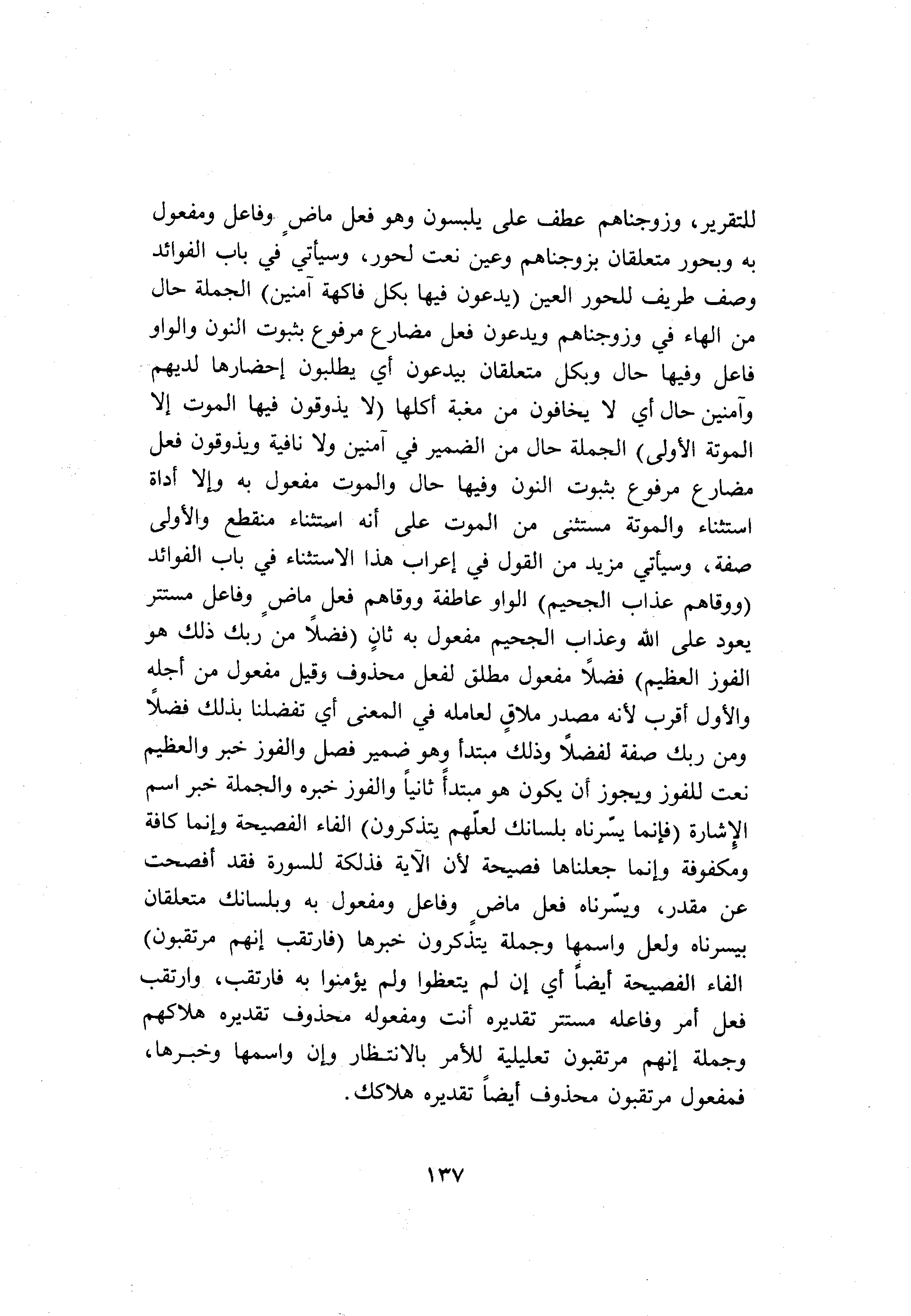 للتقرير، وزوجناهم عطف على يلبسون وهو فعل ماض وفاعل ومفعول به وبحور متعلقان بزوجناهم وعين نعت لحور، وسيأتي في باب الفوائد وصف طريف للحور العين (يَدْعُونَ فِيها بِكُلِّ فاكِهَةٍ آمِنِينَ) الجملة حال من الهاء في وزوجناهم ويدعون فعل مضارع مرفوع بثبوت النون والواو فاعل وفيها حال وبكل متعلقان بيدعون أي يطلبون إحضارها لديهم وآمنين حال أي لا يخافون من مغبة أكلها (لا يَذُوقُونَ فِيهَا الْمَوْتَ إِلَّا الْمَوْتَةَ الْأُولى) الجملة حال من الضمير في آمنين ولا نافية ويذوقون فعل مضارع مرفوع بثبوت النون وفيها حال والموت مفعول به وإلا أداة استثناء والموتة مستثنى من الموت على أنه استثناء منقطع والأولى صفة، وسيأتي مزيد من القول في إعراب هذا الاستثناء في باب الفوائد (وَوَقاهُمْ عَذابَ الْجَحِيمِ) الواو عاطفة ووقاهم فعل ماض وفاعل مستتر يعود على الله وعذاب الجحيم مفعول به ثان (فَضْلًا مِنْ رَبِّكَ ذلِكَ هُوَ الْفَوْزُ الْعَظِيمُ) فضلا مفعول مطلق لفعل محذوف وقيل مفعول من أجله والأول أقرب لأنه مصدر ملاق لعامله في المعنى أي تفضلنا بذلك فضلا ومن ربك صفة لفضلا وذلك مبتدأ وهو ضمير فصل والفوز خبر والعظيم نعت للفوز ويجوز أن يكون هو مبتدأ ثانيا والفوز خبره والجملة خبر اسم الإشارة (فَإِنَّما يَسَّرْناهُ بِلِسانِكَ لَعَلَّهُمْ يَتَذَكَّرُونَ) الفاء الفصيحة وإنما كافة ومكفوفة وإنما جعلناها فصيحة لأن الآية فذلكة للسورة فقد أفصحت عن مقدر، ويسّرناه فعل ماض وفاعل ومفعول به وبلسانك متعلقان بيسرناه ولعل واسمها وجملة يتذكّرون خبرها (فَارْتَقِبْ إِنَّهُمْ مُرْتَقِبُونَ) الفاء الفصيحة أيضا أي إن لم يتعظوا ولم يؤمنوا به فارتقب، وارتقب فعل أمر وفاعله مستتر تقديره أنت ومفعوله محذوف تقديره هلاكهم وجملة إنهم مرتقبون تعليلية للأمر بالانتظار وإن واسمها وخبرها، فمفعول مرتقبون محذوف أيضا تقديره هلاكك.