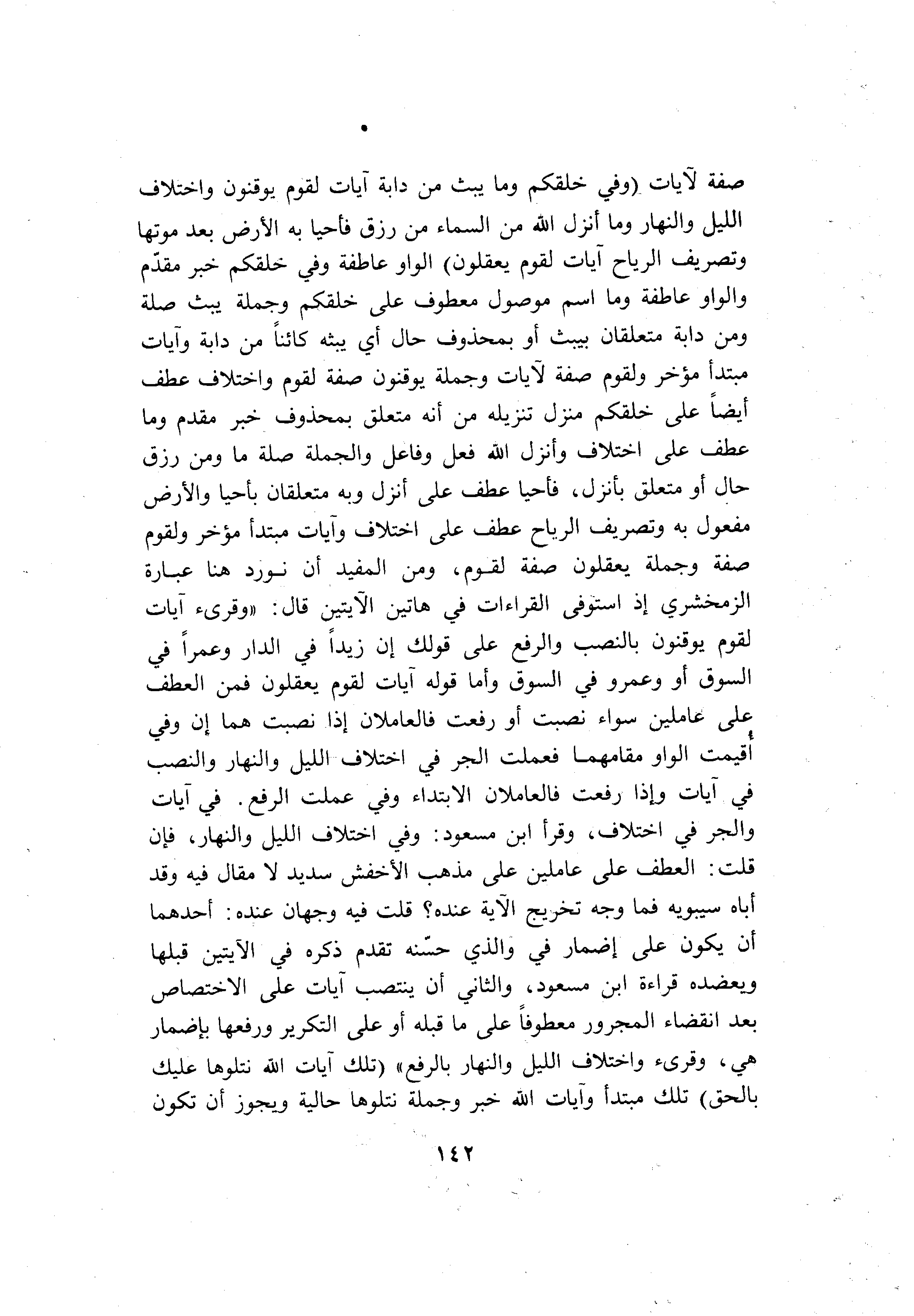 صفة لآيات (وَفِي خَلْقِكُمْ وَما يَبُثُّ مِنْ دابَّةٍ آياتٌ لِقَوْمٍ يُوقِنُونَ وَاخْتِلافِ اللَّيْلِ وَالنَّهارِ وَما أَنْزَلَ اللَّهُ مِنَ السَّماءِ مِنْ رِزْقٍ فَأَحْيا بِهِ الْأَرْضَ بَعْدَ مَوْتِها وَتَصْرِيفِ الرِّياحِ آياتٌ لِقَوْمٍ يَعْقِلُونَ) الواو عاطفة وفي خلقكم خبر مقدّم والواو عاطفة وما اسم موصول معطوف على خلقكم وجملة يبث صلة ومن دابة متعلقان بيبث أو بمحذوف حال أي يبثه كائنا من دابة وآيات مبتدأ مؤخر ولقوم صفة لآيات وجملة يوقنون صفة لقوم واختلاف عطف أيضا على خلقكم منزل تنزيله من أنه متعلق بمحذوف خبر مقدم وما عطف على اختلاف وأنزل الله فعل وفاعل والجملة صلة ما ومن رزق حال أو متعلق بأنزل، فأحيا عطف على أنزل وبه متعلقان بأحيا والأرض مفعول به وتصريف الرياح عطف على اختلاف وآيات مبتدأ مؤخر ولقوم صفة وجملة يعقلون صفة لقوم، ومن المفيد أن نورد هنا عبارة الزمخشري إذ استوفى القراءات في هاتين الآيتين قال: «وقرىء آيات لقوم يوقنون بالنصب والرفع على قولك إن زيدا في الدار وعمرا في السوق أو وعمرو في السوق وأما قوله آيات لقوم يعقلون فمن العطف على عاملين سواء نصبت أو رفعت فالعاملان إذا نصبت هما إن وفي أقيمت الواو مقامهما فعملت الجر في اختلاف الليل والنهار والنصب في آيات وإذا رفعت فالعاملان الابتداء وفي عملت الرفع. في آيات والجر في اختلاف، وقرأ ابن مسعود: وفي اختلاف الليل والنهار، فإن قلت: العطف على عاملين على مذهب الأخفش سديد لا مقال فيه وقد أباه سيبويه فما وجه تخريج الآية عنده؟ قلت فيه وجهان عنده: أحدهما أن يكون على إضمار في والذي حسّنه تقدم ذكره في الآيتين قبلها ويعضده قراءة ابن مسعود، والثاني أن ينتصب آيات على الاختصاص بعد انقضاء المجرور معطوفا على ما قبله أو على التكرير ورفعها بإضمار هي، وقرىء واختلاف الليل والنهار بالرفع» (تِلْكَ آياتُ اللَّهِ نَتْلُوها عَلَيْكَ بِالْحَقِّ) تلك مبتدأ وآيات الله خبر وجملة نتلوها حالية ويجوز أن تكون