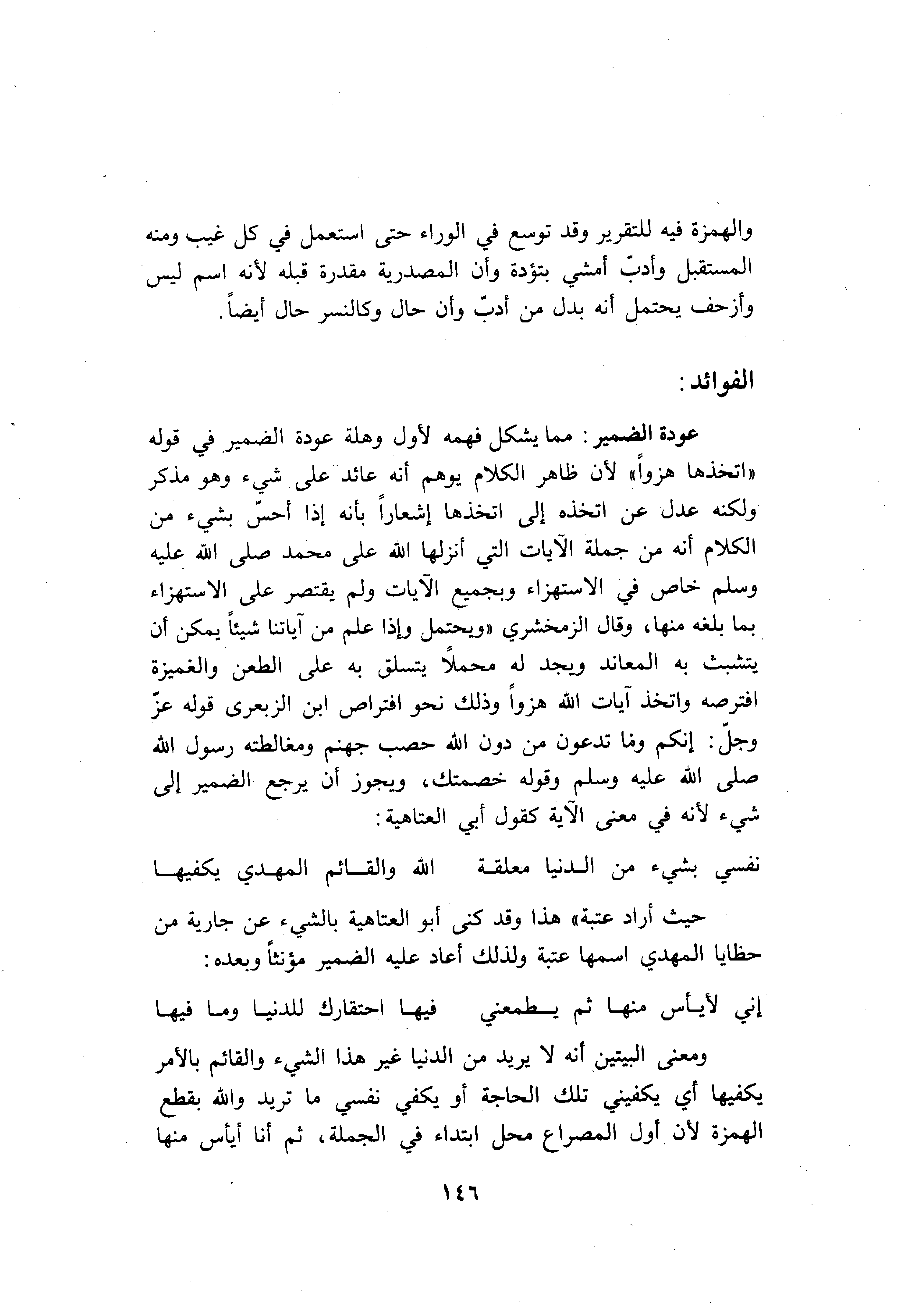 عودة الضمير: مما يشكل فهمه لأول وهلة عودة الضمير في قوله «اتخذها هزوا» لأن ظاهر الكلام يوهم أنه عائد على شيء وهو مذكر ولكنه عدل عن اتخذه إلى اتخذها إشعارا بأنه إذا أحسّ بشيء من الكلام أنه من جملة الآيات التي أنزلها الله على محمد صلى الله عليه وسلم خاص في الاستهزاء وبجميع الآيات ولم يقتصر على الاستهزاء بما بلغه منها، وقال الزمخشري «ويحتمل وإذا علم من آياتنا شيئا يمكن أن يتشبث به المعاند ويجد له محملا يتسلق به على الطعن والغميزة افترصه واتخذ آيات الله هزوا وذلك نحو افتراص ابن الزبعرى قوله عزّ وجلّ: إنكم وما تدعون من دون الله حصب جهنم ومغالطته رسول الله صلى الله عليه وسلم وقوله خصمتك، ويجوز أن يرجع الضمير إلى شيء لأنه في معنى الآية كقول أبي العتاهية: