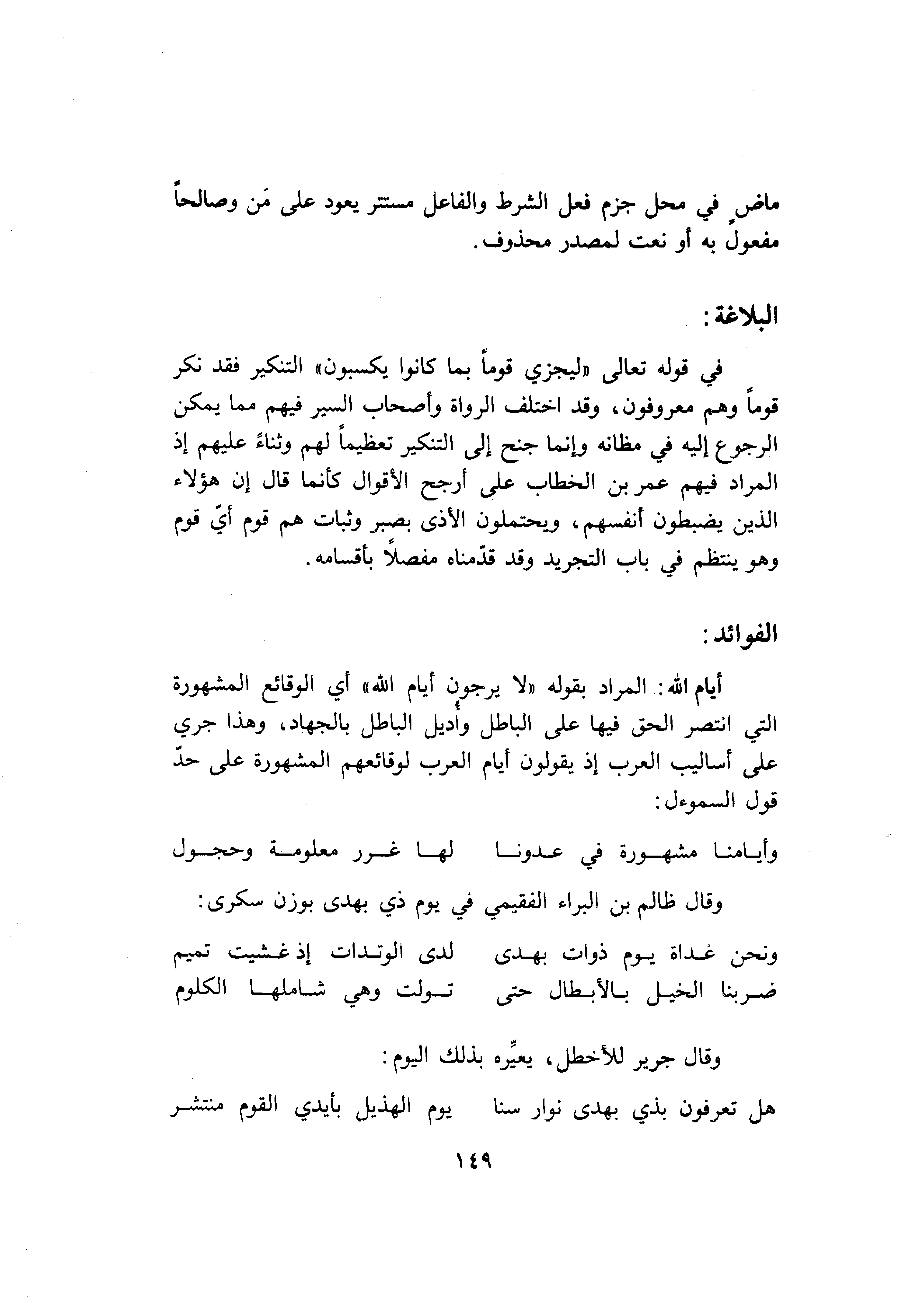 في قوله تعالى «ليجزي قوما بما كانوا يكسبون» التنكير فقد نكر قوما وهم معروفون، وقد اختلف الرواة وأصحاب السير فيهم مما يمكن الرجوع إليه في مظانه وإنما جنح إلى التنكير تعظيما لهم وثناء عليهم إذ المراد فيهم عمر بن الخطاب على أرجح الأقوال كأنما قال إن هؤلاء الذين يضبطون أنفسهم، ويحتملون الأذى بصبر وثبات هم قوم أيّ قوم وهو ينتظم في باب التجريد وقد قدّمناه مفصلا بأقسامه.