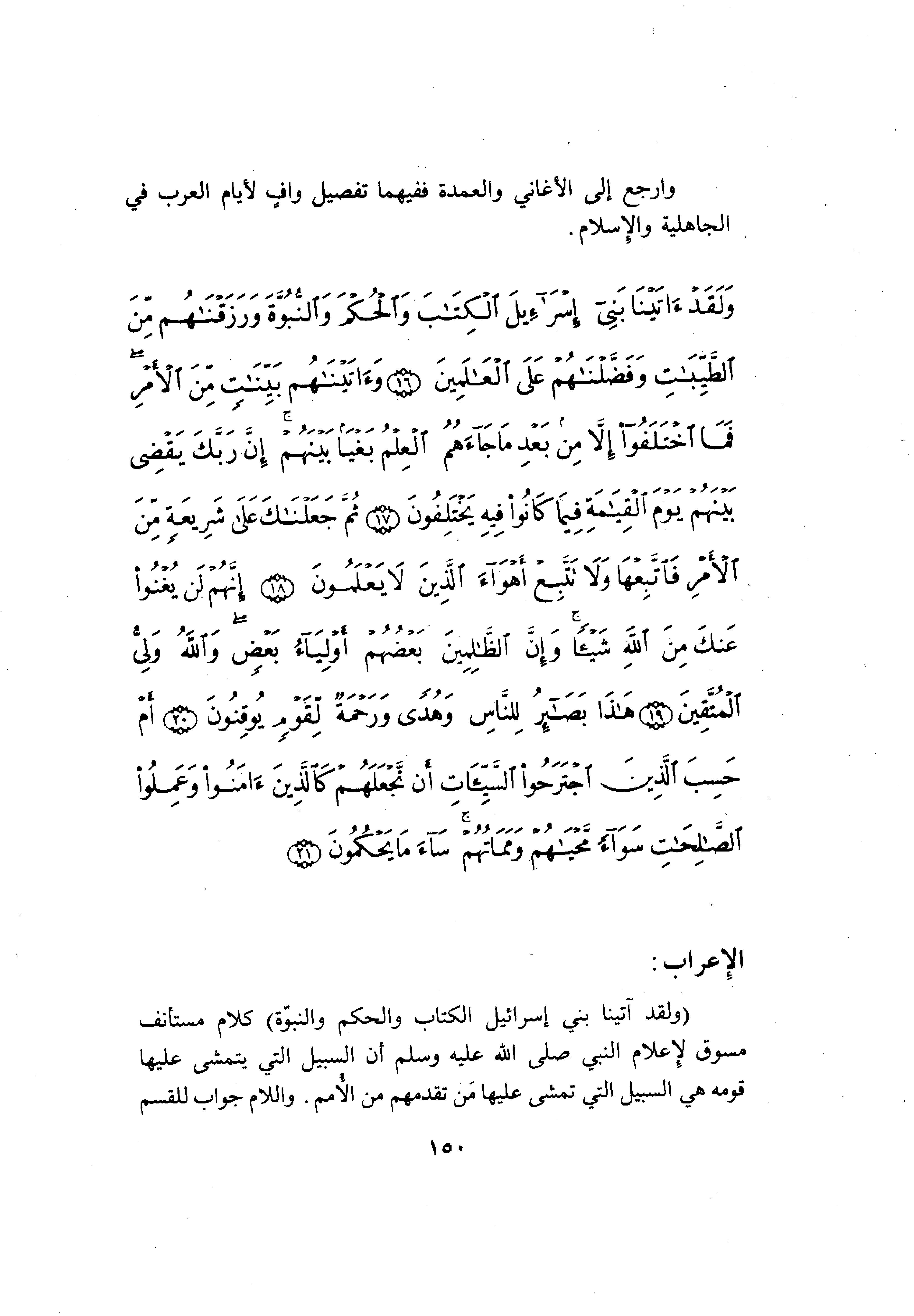 وَلَقَدْ آتَيْنا بَنِي إِسْرائِيلَ الْكِتابَ وَالْحُكْمَ وَالنُّبُوَّةَ وَرَزَقْناهُمْ مِنَ الطَّيِّباتِ وَفَضَّلْناهُمْ عَلَى الْعالَمِينَ (16) وَآتَيْناهُمْ بَيِّناتٍ مِنَ الْأَمْرِ فَمَا اخْتَلَفُوا إِلاَّ مِنْ بَعْدِ ما جاءَهُمُ الْعِلْمُ بَغْياً بَيْنَهُمْ إِنَّ رَبَّكَ يَقْضِي بَيْنَهُمْ يَوْمَ الْقِيامَةِ فِيما كانُوا فِيهِ يَخْتَلِفُونَ (17) ثُمَّ جَعَلْناكَ عَلى شَرِيعَةٍ مِنَ الْأَمْرِ فَاتَّبِعْها وَلا تَتَّبِعْ أَهْواءَ الَّذِينَ لا يَعْلَمُونَ (18) إِنَّهُمْ لَنْ يُغْنُوا عَنْكَ مِنَ اللَّهِ شَيْئاً وَإِنَّ الظَّالِمِينَ بَعْضُهُمْ أَوْلِياءُ بَعْضٍ وَاللَّهُ وَلِيُّ الْمُتَّقِينَ (19) هذا بَصائِرُ لِلنَّاسِ وَهُدىً وَرَحْمَةٌ لِقَوْمٍ يُوقِنُونَ (20)