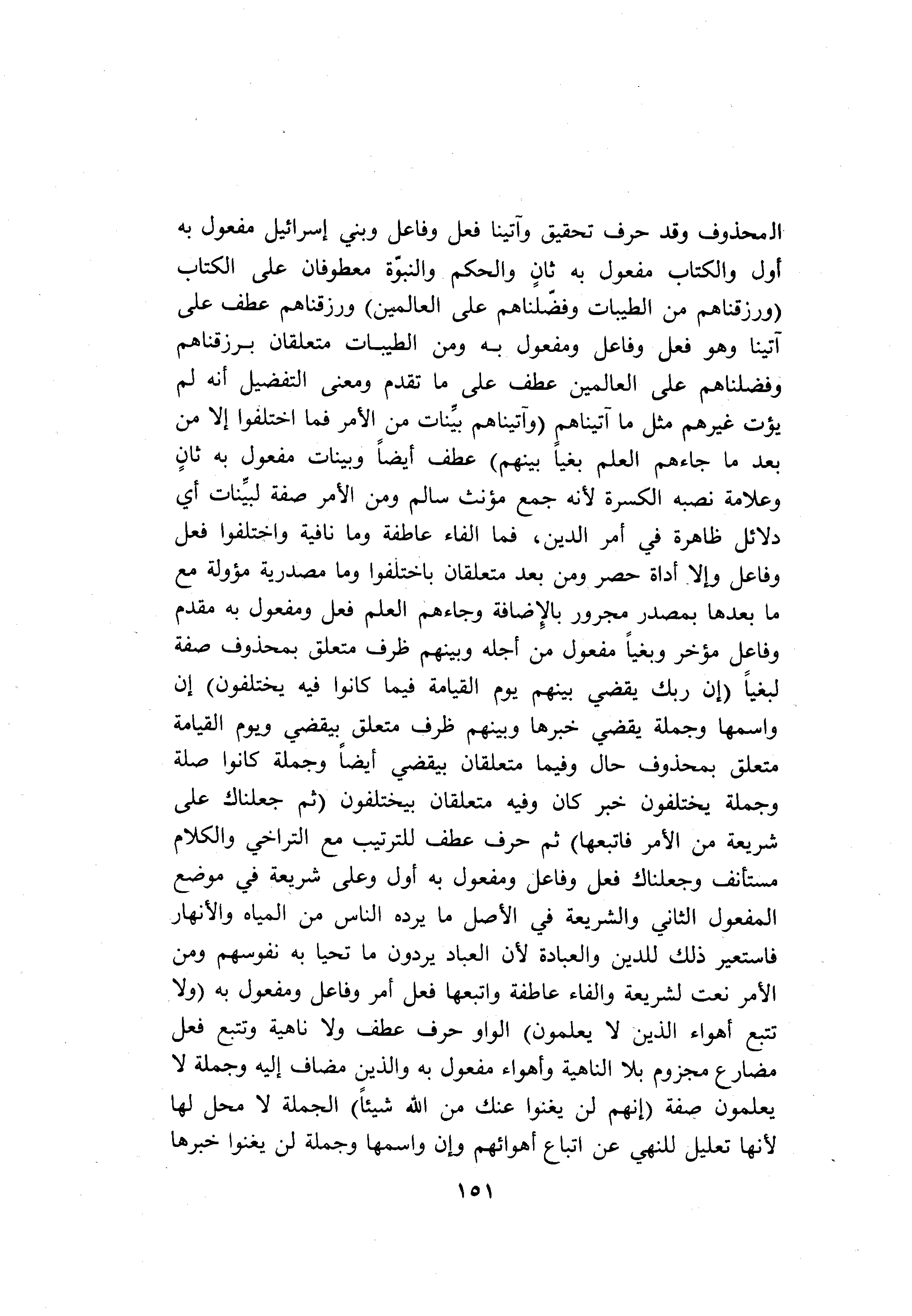 المحذوف وقد حرف تحقيق وآتينا فعل وفاعل وبني إسرائيل مفعول به أول والكتاب مفعول به ثان والحكم والنبوّة معطوفان على الكتاب (وَرَزَقْناهُمْ مِنَ الطَّيِّباتِ وَفَضَّلْناهُمْ عَلَى الْعالَمِينَ) ورزقناهم عطف على آتينا وهو فعل وفاعل ومفعول به ومن الطيبات متعلقان برزقناهم وفضلناهم على العالمين عطف على ما تقدم ومعنى التفضيل أنه لم يؤت غيرهم مثل ما آتيناهم (وَآتَيْناهُمْ بَيِّناتٍ مِنَ الْأَمْرِ فَمَا اخْتَلَفُوا إِلَّا مِنْ بَعْدِ ما جاءَهُمُ الْعِلْمُ بَغْياً بَيْنَهُمْ) عطف أيضا وبينات مفعول به ثان وعلامة نصبه الكسرة لأنه جمع مؤنث سالم ومن الأمر صفة لبيّنات أي دلائل ظاهرة في أمر الدين، فما الفاء عاطفة وما نافية واختلفوا فعلى وفاعل وإلا أداة حصر ومن بعد متعلقان باختلفوا وما مصدرية مؤولة مع ما بعدها بمصدر مجرور بالإضافة وجاءهم العلم فعل ومفعول به مقدم وفاعل مؤخر وبغيا مفعول من أجله وبينهم ظرف متعلق بمحذوف صفة لبغيا (إِنَّ رَبَّكَ يَقْضِي بَيْنَهُمْ يَوْمَ الْقِيامَةِ فِيما كانُوا فِيهِ يَخْتَلِفُونَ) إن واسمها وجملة يقضي خبرها وبينهم ظرف متعلق بيقضي ويوم القيامة متعلق بمحذوف حال وفيما متعلقان بيقضي أيضا وجملة كانوا صلة وجملة يختلفون خبر كان وفيه متعلقان بيختلفون (ثُمَّ جَعَلْناكَ عَلى شَرِيعَةٍ مِنَ الْأَمْرِ فَاتَّبِعْها) ثم حرف عطف للترتيب مع التراخي والكلام مستأنف وجعلناك فعل وفاعل ومفعول به أول وعلى شريعة في موضع المفعول الثاني والشريعة في الأصل ما يرده الناس من المياه والأنهار فاستعير ذلك للدين والعبادة لأن العباد يردون ما تحيا به نفوسهم ومن الأمر نعت لشريعة والفاء عاطفة واتبعها فعل أمر وفاعل ومفعول به (وَلا تَتَّبِعْ أَهْواءَ الَّذِينَ لا يَعْلَمُونَ)