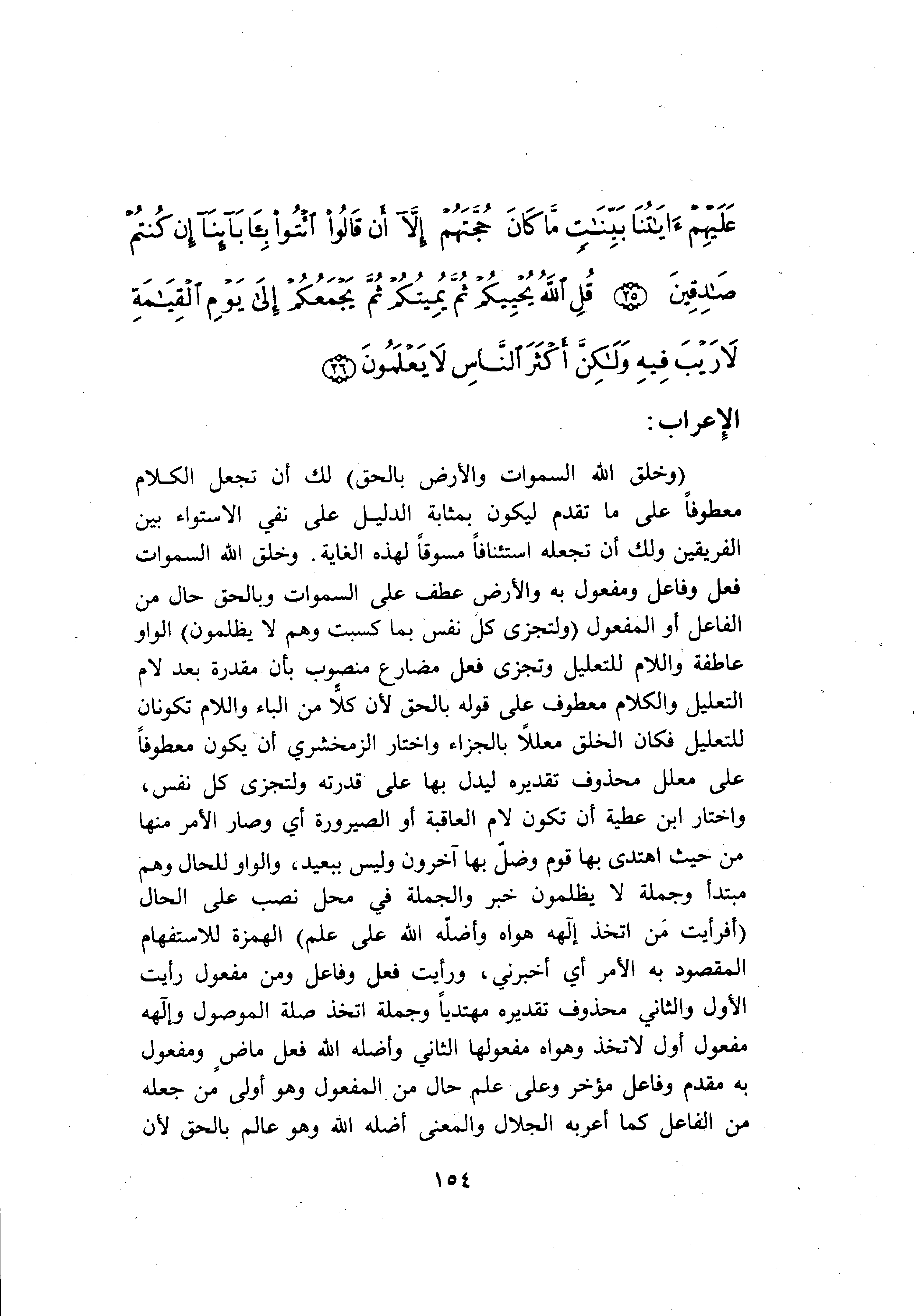 (وَخَلَقَ اللَّهُ السَّماواتِ وَالْأَرْضَ بِالْحَقِّ) لك أن تجعل الكلام معطوفا على ما تقدم ليكون بمثابة الدليل على نفي الاستواء بين الفريقين ولك أن تجعله استئنافا مسوقا لهذه الغاية. وخلق الله السموات فعل وفاعل ومفعول به والأرض عطف على السموات وبالحق حال من الفاعل أو المفعول (وَلِتُجْزى كُلُّ نَفْسٍ بِما كَسَبَتْ وَهُمْ لا يُظْلَمُونَ) الواو عاطفة واللام للتعليل وتجزى فعل مضارع منصوب بأن مقدرة بعد لام التعليل والكلام معطوف على قوله بالحق لأن كلا من الباء واللام تكونان للتعليل فكان الخلق معللا بالجزاء واختار الزمخشري أن يكون معطوفا على معلل محذوف تقديره ليدل بها على قدرته ولتجزى كل نفس، واختار ابن عطية أن تكون لام العاقبة أو الصيرورة أي وصار الأمر منها من حيث اهتدى بها قوم وضلّ بها آخرون وليس ببعيد، والواو للحال وهم مبتدأ وجملة لا يظلمون خبر والجملة في محل نصب على الحال (أَفَرَأَيْتَ مَنِ اتَّخَذَ إِلهَهُ هَواهُ وَأَضَلَّهُ اللَّهُ عَلى عِلْمٍ) الهمزة للاستفهام المقصود به الأمر أي أخبرني، ورأيت فعل وفاعل ومن مفعول رأيت الأول والثاني محذوف تقديره مهتديا وجملة اتخذ صلة الموصول وإلهه مفعول أول لاتخذ وهواه مفعولها الثاني وأضله الله فعل ماض ومفعول به مقدم وفاعل مؤخر وعلى علم حال من المفعول وهو أولى من جعله من الفاعل كما أعربه الجلال والمعنى أضله الله وهو عالم بالحق لأن