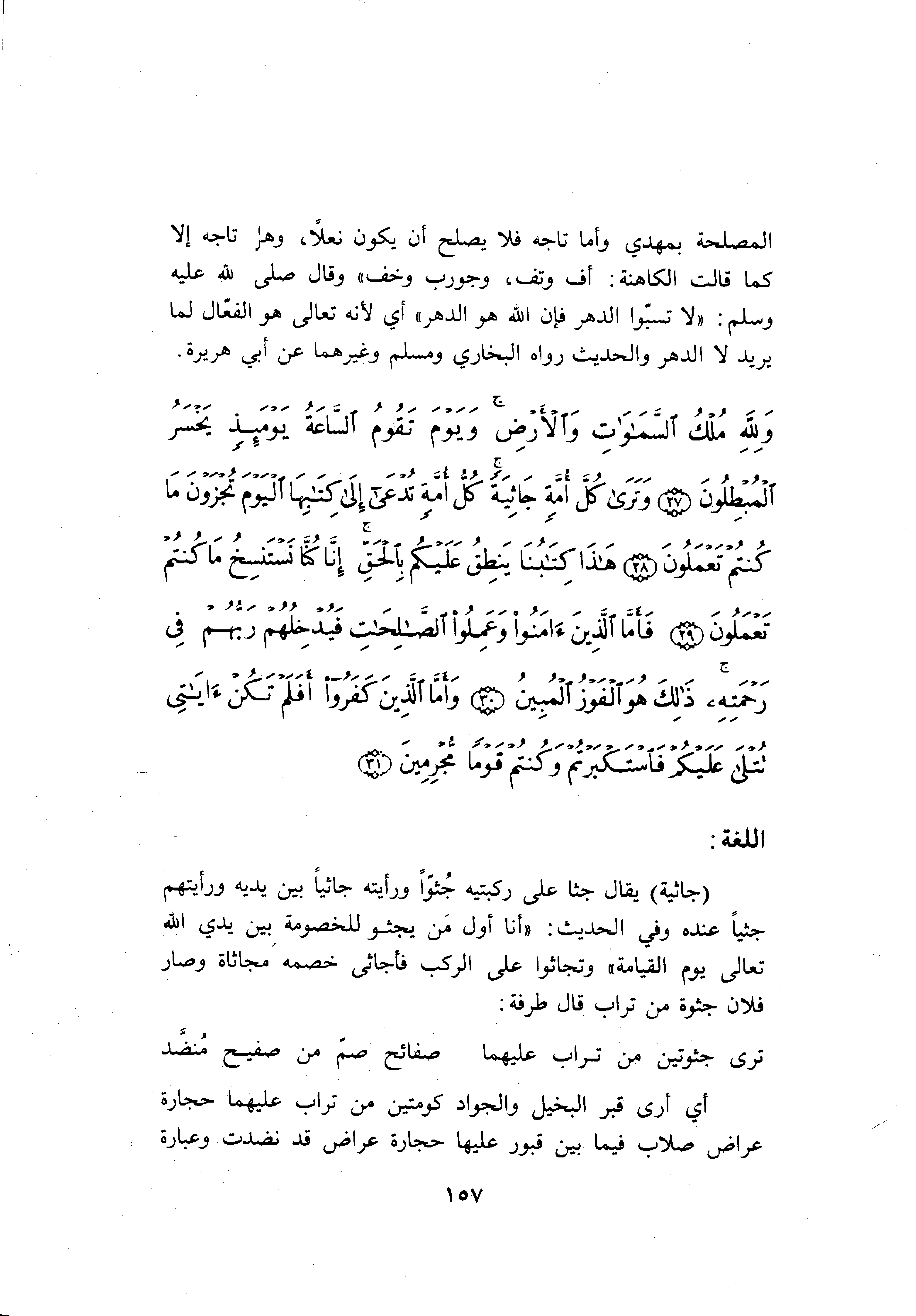 (جاثِيَةً) يقال جثا على ركبتيه جثّوا ورأيته جاثيا بين يديه ورأيتهم جثيا عنده وفي الحديث: «أنا أول من يجثو للخصومة بين يدي الله تعالى يوم القيامة» وتجاثوا على الركب فأجاثى خصمه مجاثاة وصار فلان جثوة من تراب قال طرفة: