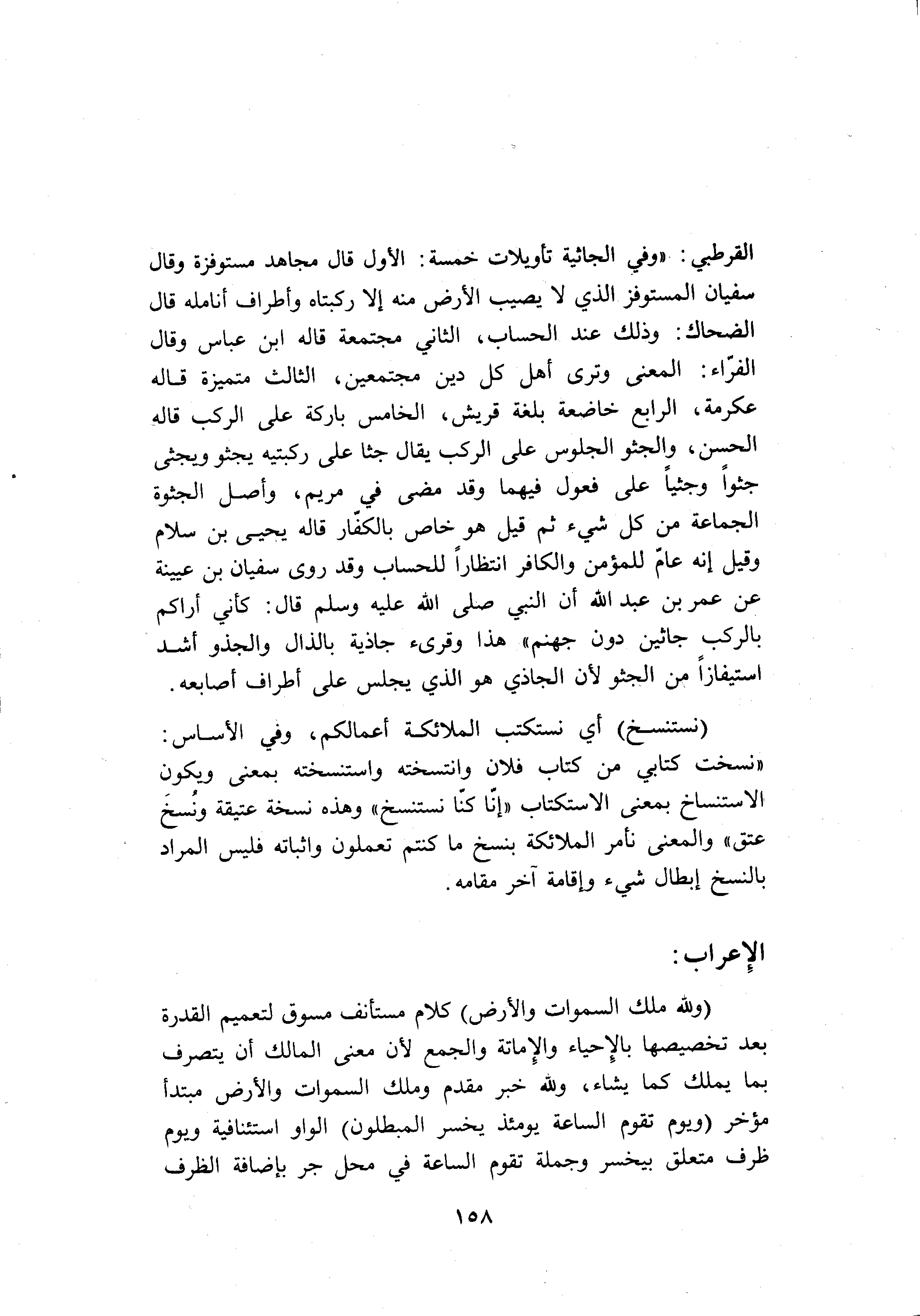 القرطبي: «وفي الجاثية تأويلات خمسة: الأول قال مجاهد مستوفزة وقال سفيان المستوفز الذي لا يصيب الأرض منه إلا ركبتاه وأطراف أنامله قال الضحاك: وذلك عند الحساب، الثاني مجتمعة قاله ابن عباس وقال الفرّاء: المعنى وترى أهل كل دين مجتمعين، الثالث متميزة قاله عكرمة، الرابع خاضعة بلغة قريش، الخامس باركة على الركب قاله الحسن، والجثو الجلوس على الركب يقال جثا على ركبتيه يجثو ويجثى جثوا وجثيا على فعول فيهما وقد مضى في مريم، وأصل الجثوة الجماعة من كل شيء ثم قيل هو خاص بالكفّار قاله يحيى بن سلام وقيل إنه عامّ للمؤمن والكافر انتظارا للحساب وقد روى سفيان بن عيينة عن عمر بن عبد الله أن النبي صلى الله عليه وسلم قال: كأني أراكم بالركب جاثين دون جهنم» هذا وقرىء جاذية بالذال والجذو أشد استيفازا من الجثو لأن الجاذي هو الذي يجلس على أطراف أصابعه.