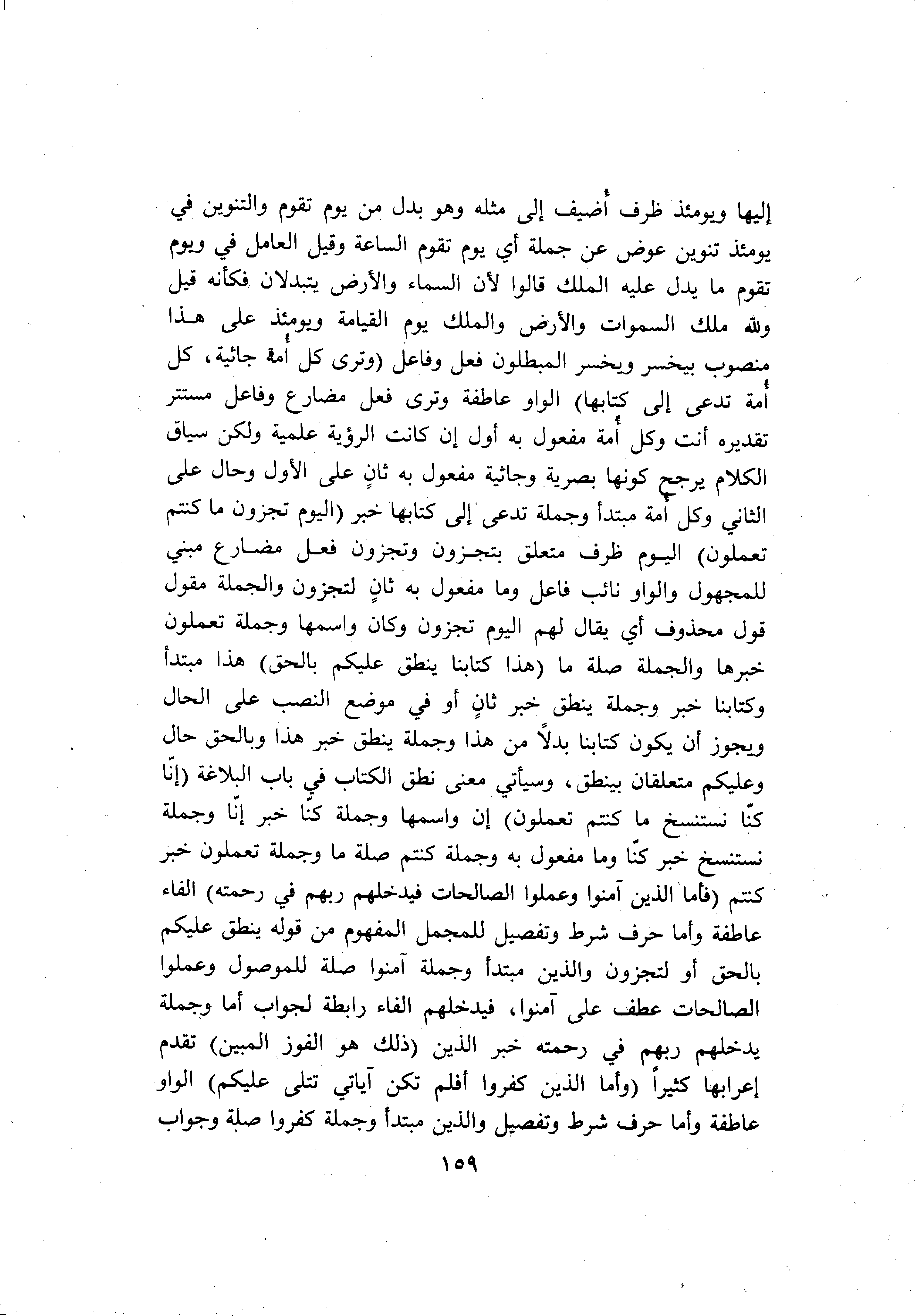 إليها ويومئذ ظرف أضيف إلى مثله وهو بدل من يوم تقوم والتنوين في يومئذ تنوين عوض عن جملة أي يوم تقوم الساعة وقيل العامل في ويوم تقوم ما يدل عليه الملك قالوا لأن السماء والأرض يتبدلان فكأنه قيل ولله ملك السموات والأرض والملك يوم القيامة ويومئذ على هذا منصوب بيخسر ويخسر المبطلون فعل وفاعل (وَتَرى كُلَّ أُمَّةٍ جاثِيَةً، كُلُّ أُمَّةٍ تُدْعى إِلى كِتابِهَا) الواو عاطفة وترى فعل مضارع وفاعل مستتر تقديره أنت وكل أمة مفعول به أول إن كانت الرؤية علمية ولكن سياق الكلام يرجح كونها بصرية وجاثية مفعول به ثان على الأول وحال على الثاني وكل أمة مبتدأ وجملة تدعى إلى كتابها خبر (الْيَوْمَ تُجْزَوْنَ ما كُنْتُمْ تَعْمَلُونَ) اليوم ظرف متعلق بتجزون وتجزون فعل مضارع مبني للمجهول والواو نائب فاعل وما مفعول به ثان لتجزون والجملة مقول قول محذوف أي يقال لهم اليوم تجزون وكان واسمها وجملة تعملون خبرها والجملة صلة ما (هذا كِتابُنا يَنْطِقُ عَلَيْكُمْ بِالْحَقِّ) هذا مبتدأ وكتابنا خبر وجملة ينطق خبر ثان أو في موضع النصب على الحال ويجوز أن يكون كتابنا بدلا من هذا وجملة ينطق خبر هذا وبالحق حال وعليكم متعلقان بينطق، وسيأتي معنى نطق الكتاب في باب البلاغة (إِنَّا كُنَّا نَسْتَنْسِخُ ما كُنْتُمْ تَعْمَلُونَ) إن واسمها وجملة كنّا خبر إنّا وجملة نستنسخ خبر كنّا وما مفعول به وجملة كنتم صلة ما وجملة تعملون خبر كنتم (فَأَمَّا الَّذِينَ آمَنُوا وَعَمِلُوا الصَّالِحاتِ فَيُدْخِلُهُمْ رَبُّهُمْ فِي رَحْمَتِهِ) الفاء عاطفة وأما حرف شرط وتفصيل للمجمل المفهوم من قوله ينطق عليكم بالحق أو لتجزون والذين مبتدأ وجملة آمنوا صلة للموصول وعملوا الصالحات عطف على آمنوا، فيدخلهم الفاء رابطة لجواب أما وجملة يدخلهم ربهم في رحمته خبر الذين (ذلِكَ هُوَ الْفَوْزُ الْمُبِينُ) تقدم إعرابها كثيرا (وَأَمَّا الَّذِينَ كَفَرُوا أَفَلَمْ تَكُنْ آياتِي تُتْلى عَلَيْكُمْ) الواو عاطفة وأما حرف شرط وتفصيل والذين مبتدأ وجملة كفروا صلة وجواب
