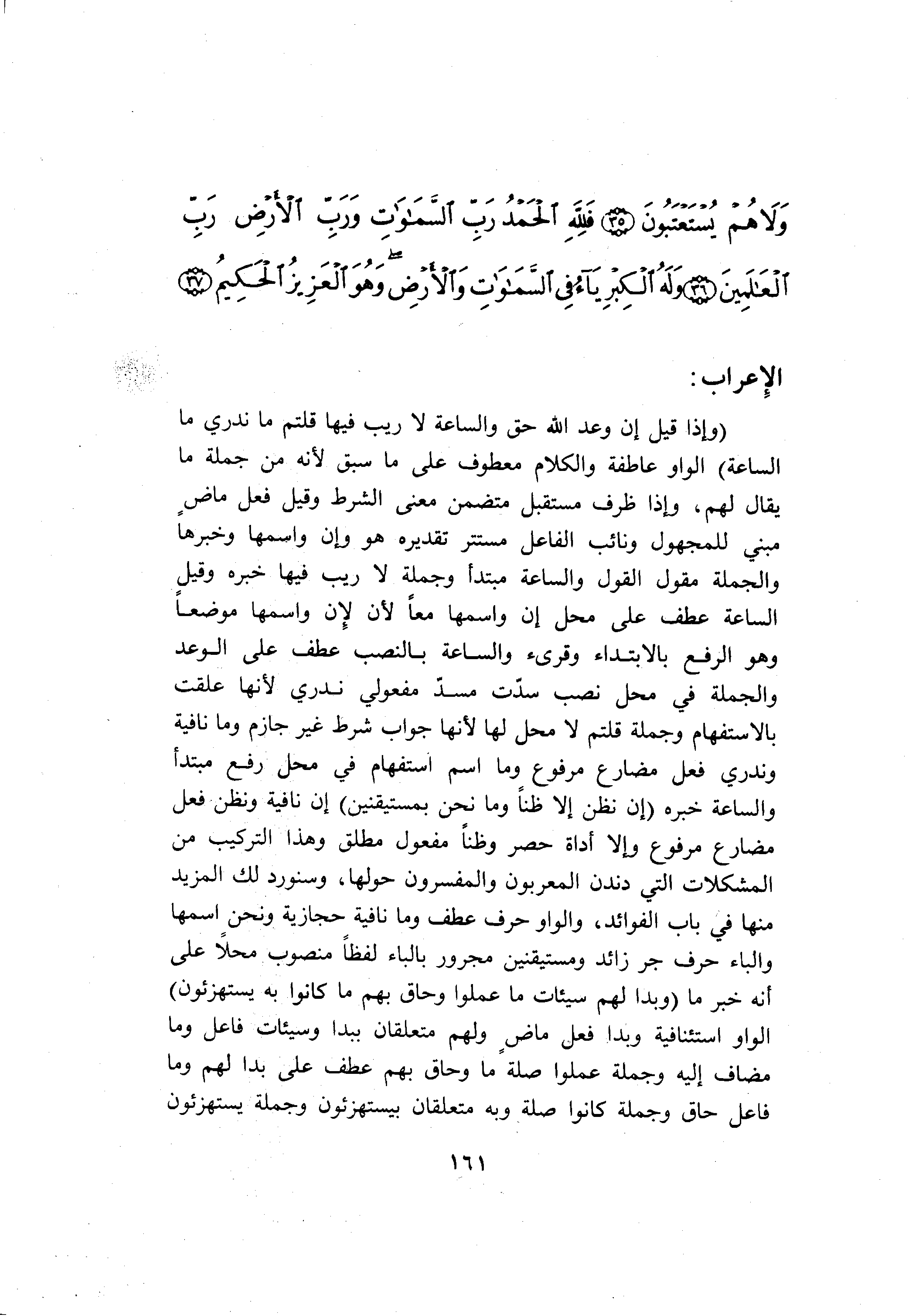 (وَإِذا قِيلَ إِنَّ وَعْدَ اللَّهِ حَقٌّ وَالسَّاعَةُ لا رَيْبَ فِيها قُلْتُمْ ما نَدْرِي مَا السَّاعَةُ) الواو عاطفة والكلام معطوف على ما سبق لأنه من جملة ما يقال لهم، وإذا ظرف مستقبل متضمن معنى الشرط وقيل فعل ماض مبني للمجهول ونائب الفاعل مستتر تقديره هو وإن واسمها وخبرها والجملة مقول القول والساعة مبتدأ وجملة لا ريب فيها خبره وقيل الساعة عطف على محل إن واسمها معا لأن لإن واسمها موضعا وهو الرفع بالابتداء وقرئ والساعة بالنصب عطف على الوعد والجملة في محل نصب سدّت مسدّ مفعولي ندري لأنها علقت بالاستفهام وجملة قلتم لا محل لها لأنها جواب شرط غير جازم وما نافية وندري فعل مضارع مرفوع وما اسم استفهام في محل رفع مبتدأ والساعة خبره (إِنْ نَظُنُّ إِلَّا ظَنًّا وَما نَحْنُ بِمُسْتَيْقِنِينَ) إن نافية ونظن فعل مضارع مرفوع وإلا أداة حصر وظنا مفعول مطلق وهذا التركيب من المشكلات التي دندن المعربون والمفسرون حولها، وسنورد لك المزيد منها في باب الفوائد، والواو حرف عطف وما نافية حجازية ونحن اسمها والباء حرف جر زائد ومستيقنين مجرور بالباء لفظا منصوب محلا على أنه خبر ما (وَبَدا لَهُمْ سَيِّئاتُ ما عَمِلُوا وَحاقَ بِهِمْ ما كانُوا بِهِ يَسْتَهْزِؤُنَ) الواو استئنافية وبدا فعل ماض ولهم متعلقان ببدا وسيئات فاعل وما مضاف إليه وجملة عملوا صلة ما وحاق بهم عطف على بدا لهم وما فاعل حاق وجملة كانوا صلة وبه متعلقان بيستهزئون وجملة يستهزئون
