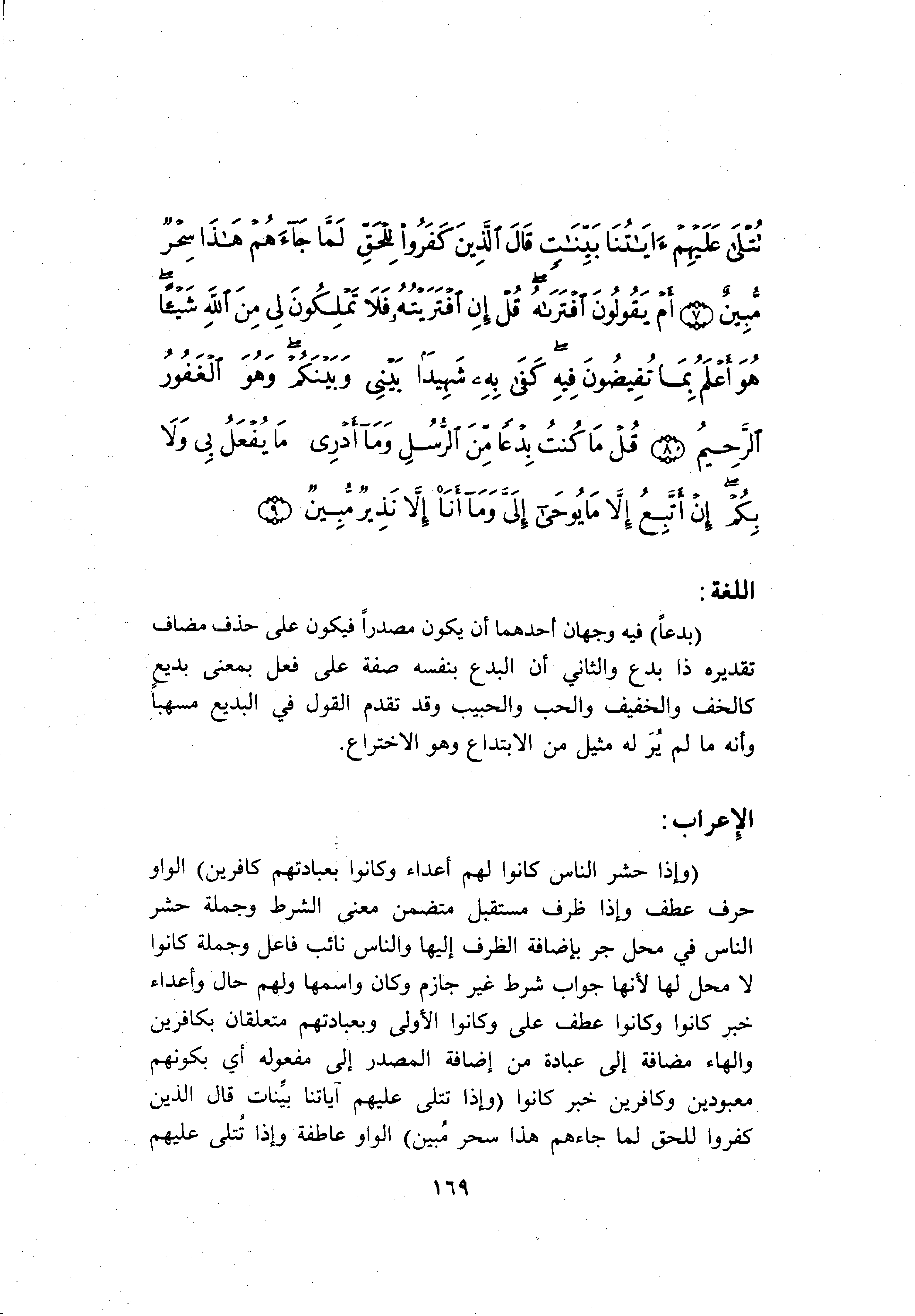 (وَإِذا حُشِرَ النَّاسُ كانُوا لَهُمْ أَعْداءً وَكانُوا بِعِبادَتِهِمْ كافِرِينَ) الواو حرف عطف وإذا ظرف مستقبل متضمن معنى الشرط وجملة حشر الناس في محل جر بإضافة الظرف إليها والناس نائب فاعل وجملة كانوا لا محل لها لأنها جواب شرط غير جازم وكان واسمها ولهم حال وأعداء خبر كانوا وكانوا عطف على وكانوا الأولى وبعبادتهم متعلقان بكافرين والهاء مضافة إلى عبادة من إضافة المصدر إلى مفعوله أي بكونهم معبودين وكافرين خبر كانوا (وَإِذا تُتْلى عَلَيْهِمْ آياتُنا بَيِّناتٍ قالَ الَّذِينَ كَفَرُوا لِلْحَقِّ لَمَّا جاءَهُمْ هذا سِحْرٌ مُبِينٌ) الواو عاطفة وإذا تتلى عليهم