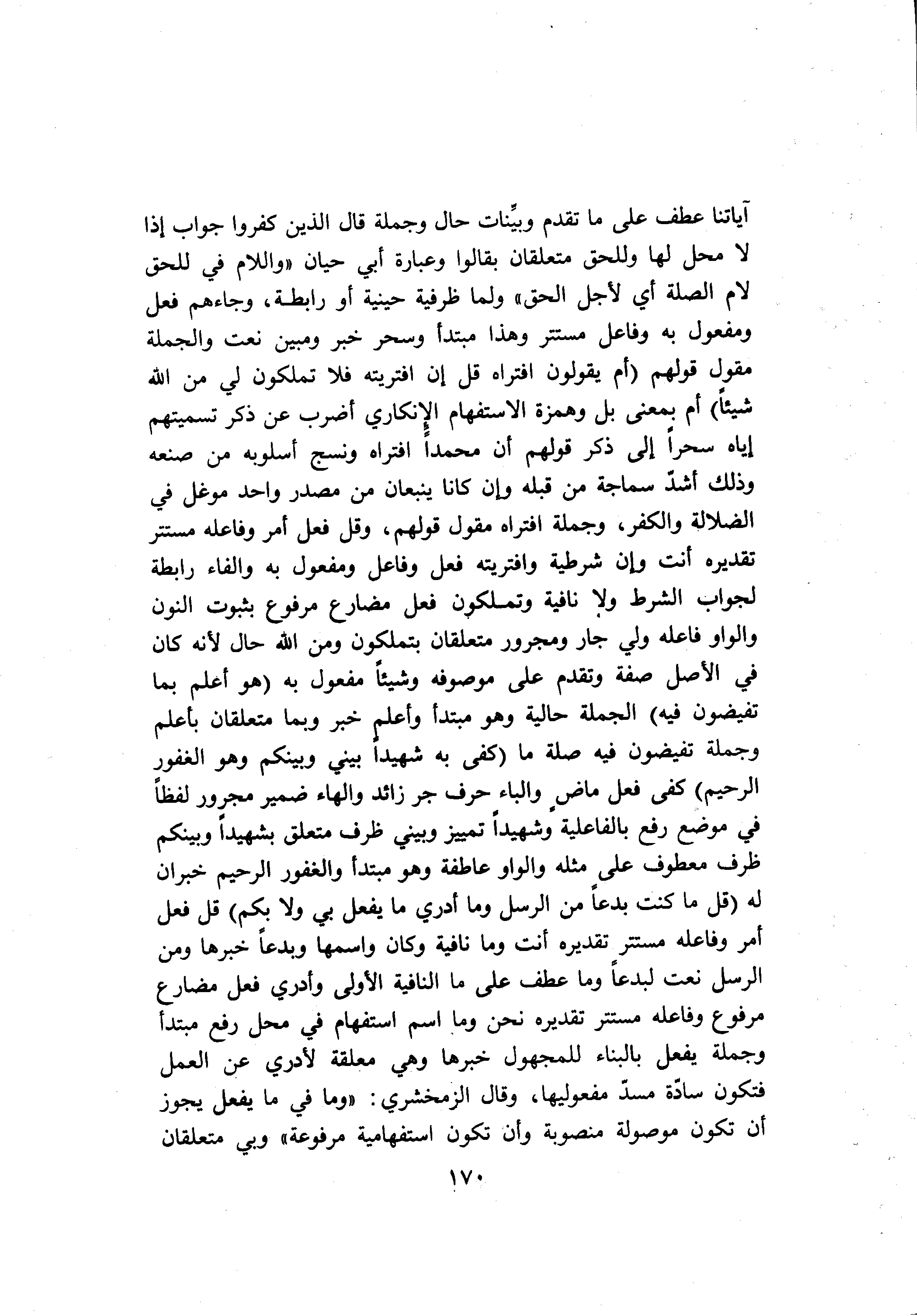 آياتنا عطف على ما تقدم وبيّنات حال وجملة قال الذين كفروا جواب إذا لا محل لها وللحق متعلقان بقالوا وعبارة أبي حيان «واللام في للحق لام الصلة أي لأجل الحق» ولما ظرفية حينية أو رابطة، وجاءهم فعل ومفعول به وفاعل مستتر وهذا مبتدأ وسحر خبر ومبين نعت والجملة مقول قولهم (أَمْ يَقُولُونَ افْتَراهُ قُلْ إِنِ افْتَرَيْتُهُ فَلا تَمْلِكُونَ لِي مِنَ اللَّهِ شَيْئاً) أم بمعنى بل وهمزة الاستفهام الإنكاري أضرب عن ذكر تسميتهم إياه سحرا إلى ذكر قولهم أن محمدا افتراه ونسج أسلوبه من صنعه وذلك أشدّ سماجة من قبله وإن كانا ينبعان من مصدر واحد موغل في الضلالة والكفر، وجملة افتراه مقول قولهم، وقل فعل أمر وفاعله مستتر تقديره أنت وإن شرطية وافتريته فعل وفاعل ومفعول به والفاء رابطة لجواب الشرط ولا نافية وتملكون فعل مضارع مرفوع بثبوت النون والواو فاعله ولي جار ومجرور متعلقان بتملكون ومن الله حال لأنه كان في الأصل صفة وتقدم على موصوفة وشيئا مفعول به (هُوَ أَعْلَمُ بِما تُفِيضُونَ فِيهِ) الجملة حالية وهو مبتدأ وأعلم خبر وبما متعلقان بأعلم وجملة تفيضون فيه صلة ما (كَفى بِهِ شَهِيداً بَيْنِي وَبَيْنَكُمْ وَهُوَ الْغَفُورُ الرَّحِيمُ) كفى فعل ماض والباء حرف جر زائد والهاء ضمير مجرور لفظا في موضع رفع بالفاعلية وشهيدا تمييز وبيني ظرف متعلق بشهيدا وبينكم ظرف معطوف على مثله والواو عاطفة وهو مبتدأ والغفور الرحيم خبران له (قُلْ ما كُنْتُ بِدْعاً مِنَ الرُّسُلِ وَما أَدْرِي ما يُفْعَلُ بِي وَلا بِكُمْ) قل فعل أمر وفاعله مستتر تقديره أنت وما نافية وكان واسمها وبدعا خبرها ومن الرسل نعت لبدعا وما عطف على ما النافية الأولى وأدري فعل مضارع مرفوع وفاعله مستتر تقديره نحن وما اسم استفهام في محل رفع مبتدأ وجملة يفعل بالبناء للمجهول خبرها وهي معلقة لأدري عن العمل فتكون سادّة مسدّ مفعوليها، وقال الزمخشري: «وما في ما يفعل يجوز أن تكون موصولة منصوبة وأن تكون استفهامية مرفوعة» وبي متعلقان