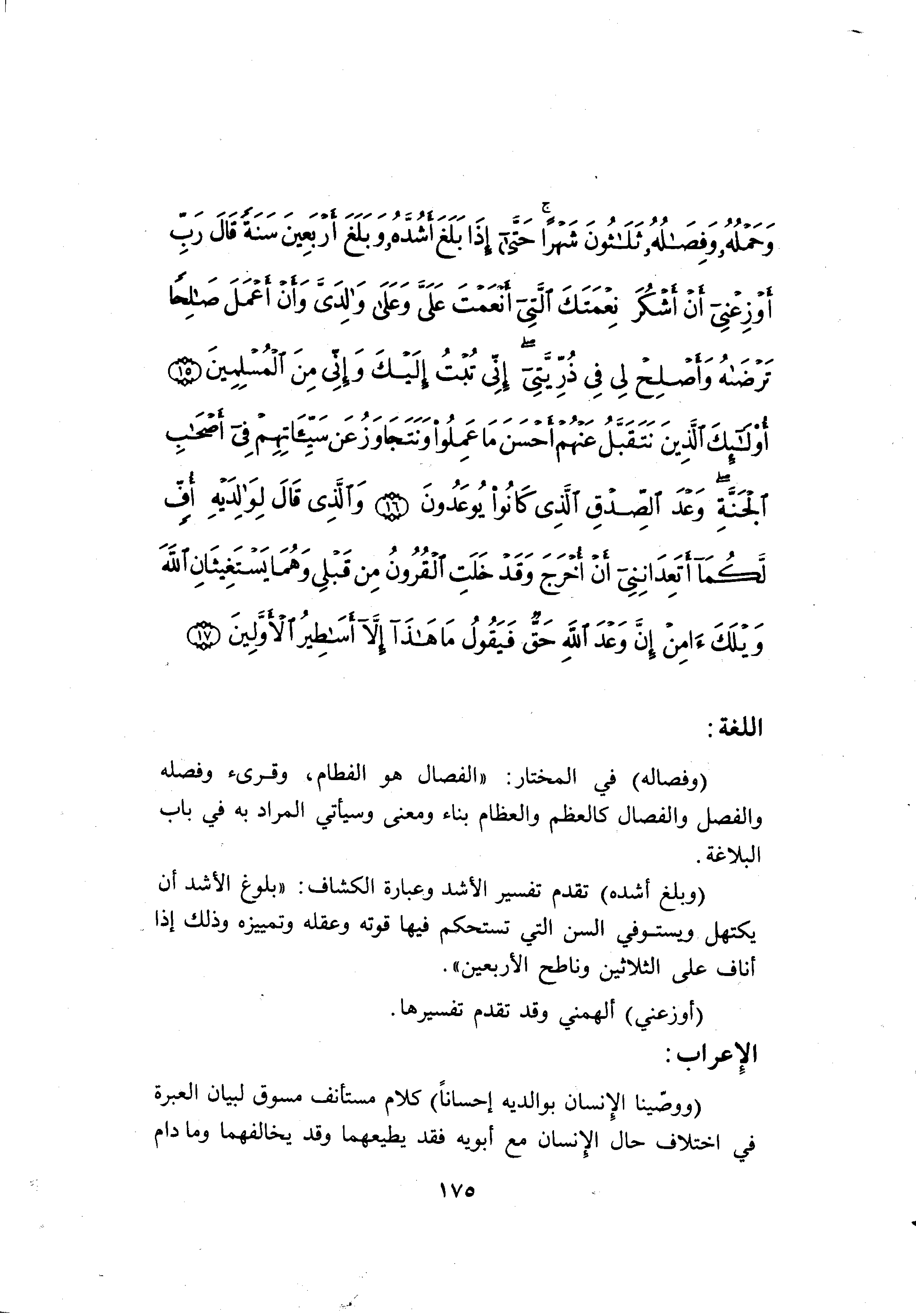 و (بَلَغَ أَشُدَّهُ) تقدم تفسير الأشد وعبارة الكشاف: «بلوغ الأشد أن يكتهل ويستوفي السن التي تستحكم فيها قوته وعقله وتمييزه وذلك إذا أناف على الثلاثين وناطح الأربعين» .